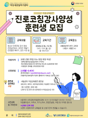 여성정책 > 기관단체 소식 [세종여성새로일하기센터] 2026 직업교육훈련 '진로코칭강사 양성' 과정2026.02.25