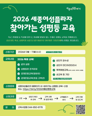 정보나눔 > 공지사항 세종여성플라자 여성소식지 기자단 서포터즈 새봄 5기 결과발표2026.03.03