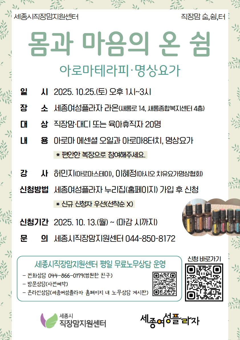 [직장맘 숨,쉼,터] 몸과 마음의 온 쉼 : 아로마테라피, 명상요가