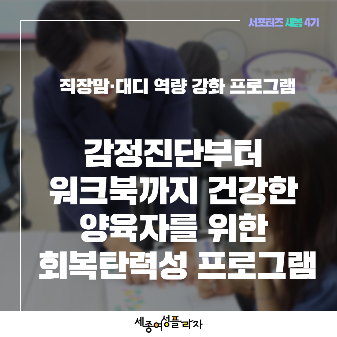 | [세종여성플라자 새봄_직장맘·대디 역량 강화 프로그램] 감정진단부터 워크북까지, 건강한 양육자를 위한 회복탄력성 프로그램 | |
