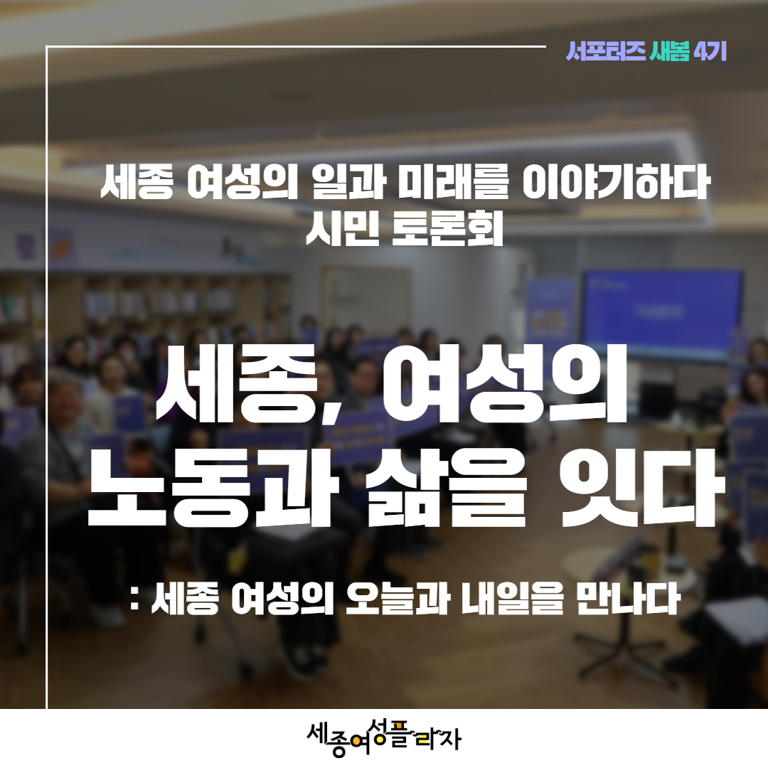 | [세종여성플라자 새봄_세종 여성의 일과 미래를 이야기하다 시민 토론회] 세종, 여성의 노동과 삶을 잇다 : 세종 여성의 오늘과 내일을 만나다 | |