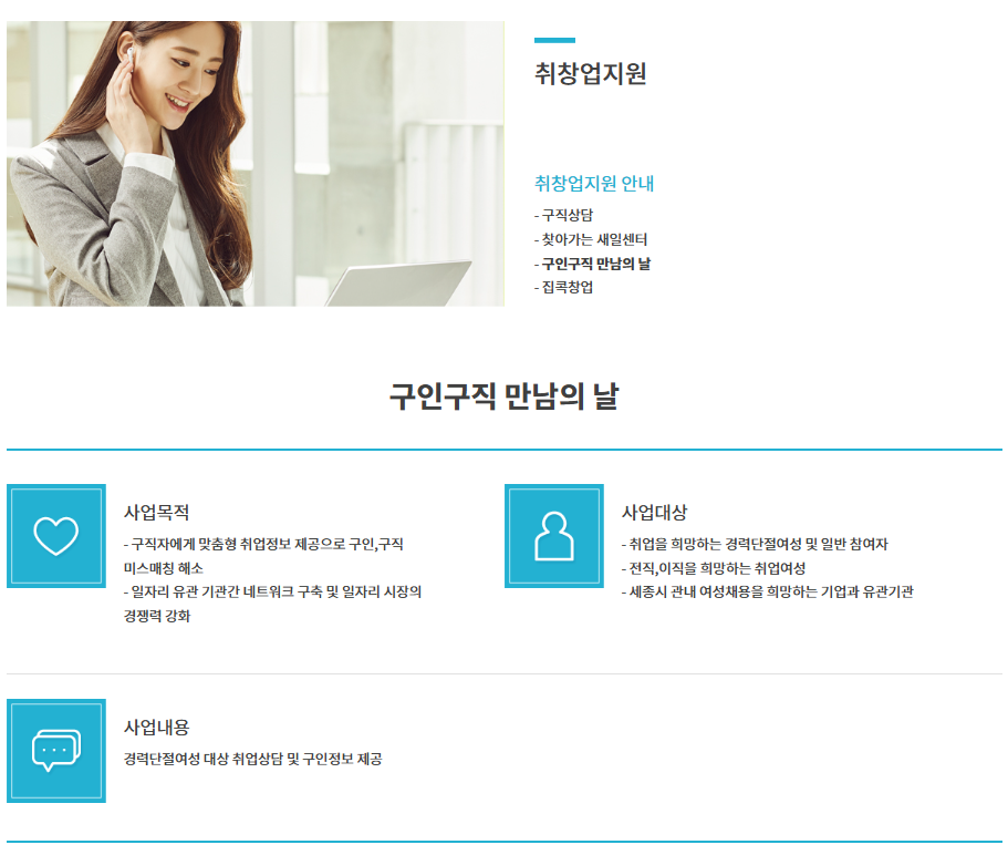 | 지원 규모 | 지원 대상 | - 취업을 희망하는 경력단절여성 및 일반 참여자 - 전직,이직을 희망하는 취업여성 - 세종시 관내 여성채용을 희망하는 기업과 유관기관 |