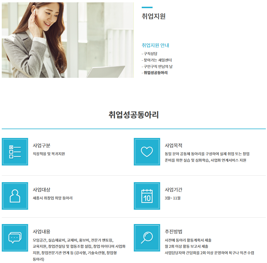 | 지원 기관 | 세종여성새로일하기센터 | 신청 방법 | 세종여성새로일하기센터 홈페이지 참조 |