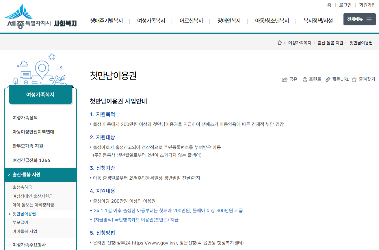 | 지원 기관 | 세종시 여성가족과 | 신청 방법 | 거주지 읍, 면, 동 주민센터 방문 신청 또는 온라인 '정부24'에서 신청 가능. |