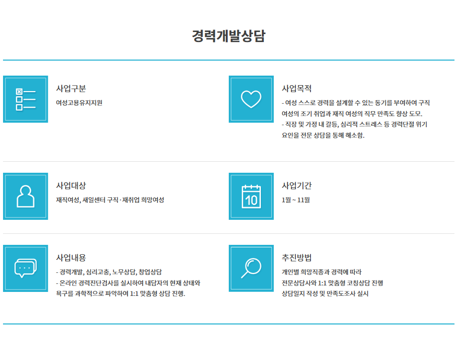 | 정책 소개 | 여성근로자의 지속적인 경력개발의 방향을 잡아주고 경력단절예방을 위한 역량강화. 경력단절예방을 위해 스스로 자신의 경력 상황을 점검하고 그에 맞는 경력 가이드라인 준비 | 정책 내용 | 여성 근로자의 경력경로 설계 및 관리, 직무정보 탐색, 이직상담, 경력 목표 설정을 통한 셀프리더십, 새내기 근로자를 위한 경력개발 상담 등 개인별 희망직종과 경력에 따라 전문상담사와 1:1 맞춤형 코칭상담 진행, 상담일지 작성 및 만족도 조사 실시 |