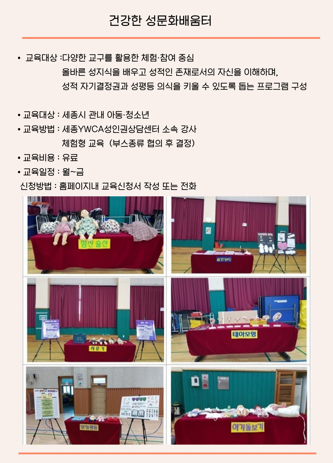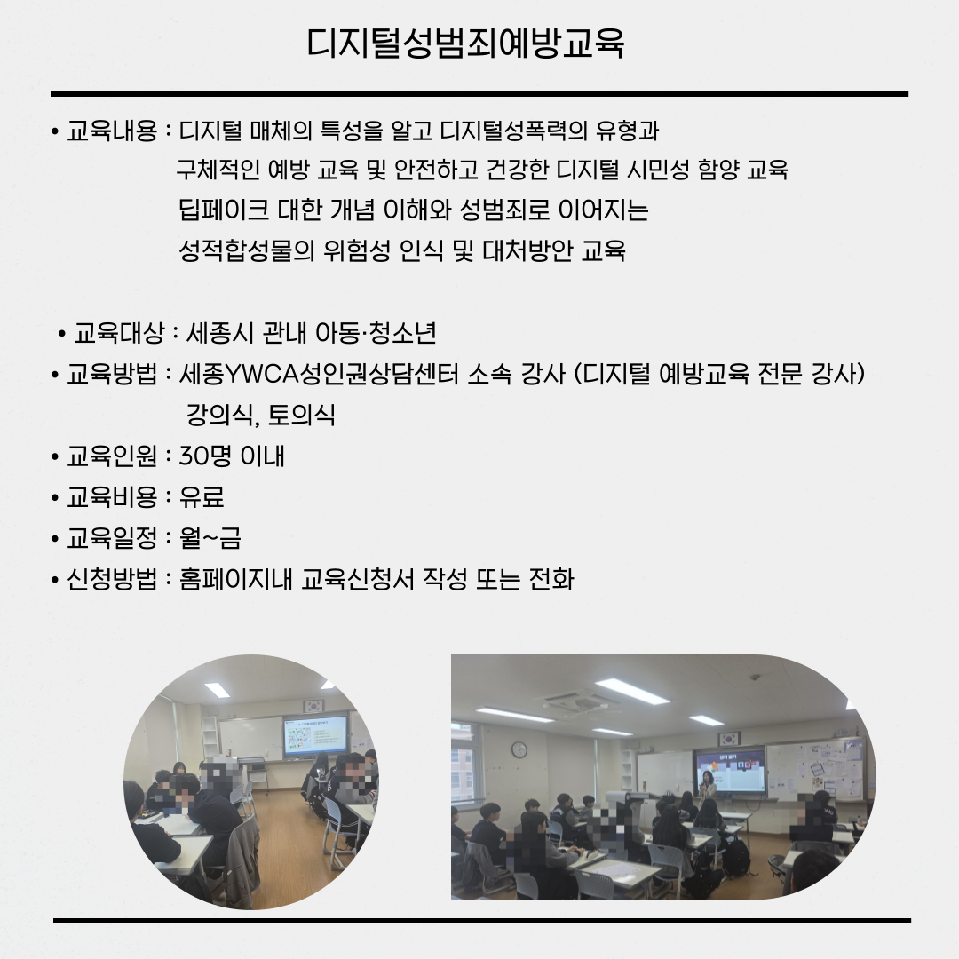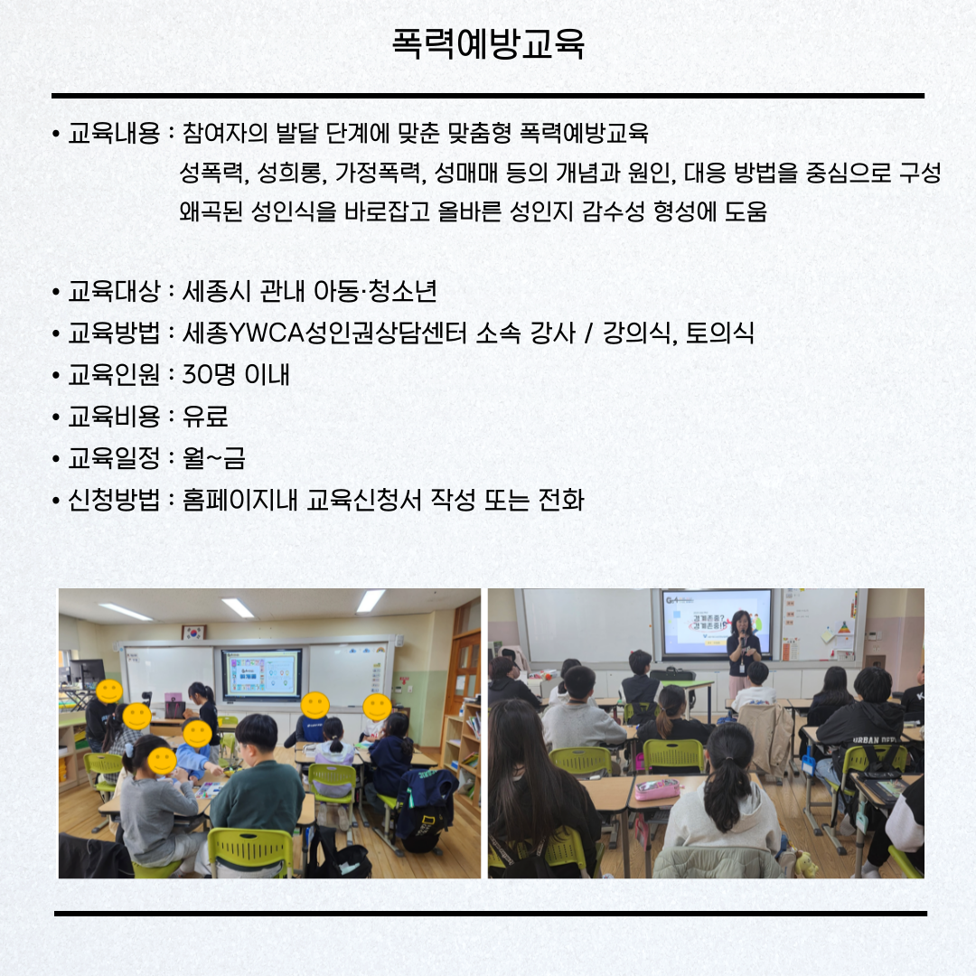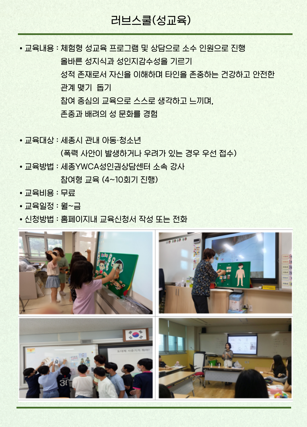 | 지원 규모 | 폭력예방교육-유료 디지털성범죄예방교육-유료 건강한성문화배움터-유료 러브스쿨(성교육)-무료 |