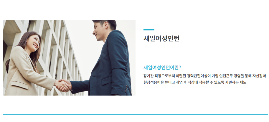 | 정책 소개 | 장기간 직장으로부터 이탈된 경력단절여성이 기업 인턴근무 경험을 통해 자신감과 현장적응력을 높이고, 취업 후 직장에 적응할 수 있도록 지원하는 제도 | 정책 내용 | * 근무조건 1) 전일제 원칙(일부 양질의 시간제 근무가능) 2) 근무시간: 주25시간 이상(결혼이민여성 주 30시간 이상) 3) 인턴 종료 후 상용직 또는 정규직 전환(기한의 정함이 없거나 계약기간 1년 이상) |