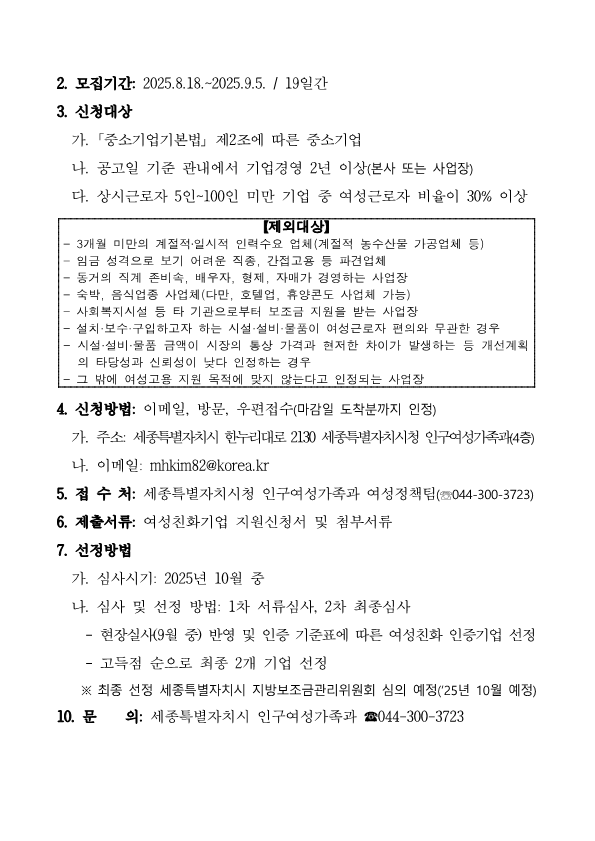 지원 기관 | 세종특별자치시 | 신청 방법 | 신청방법: 이메일, 방문, 우편접수(마감일 도착분까지 인정) 가. 주소: 세종특별자치시 한누리대로 2130 세종특별자치시청 인구여성가족과(4층) 나. 이메일: mhkim82@korea.kr ※ 제출서류 1) 세종형 여성친화기업 지원 신청서 1부 2) 여성친화적 기업문화 및 환경조성을 위한 계획서 1부 3) 2025년 세종형 여성친화기업 인증 점검표 1부 4) 사업자등록증 사본 1부 |