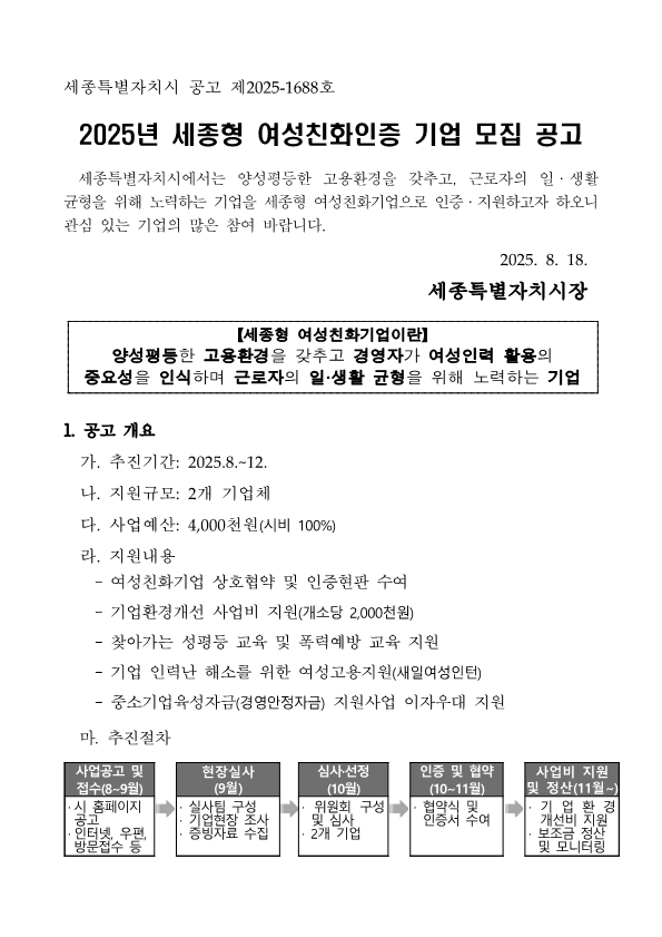정책이름 | 2025년 세종형 여성친화인증 기업 모집 공고 | 정책 분야 | 교육 |