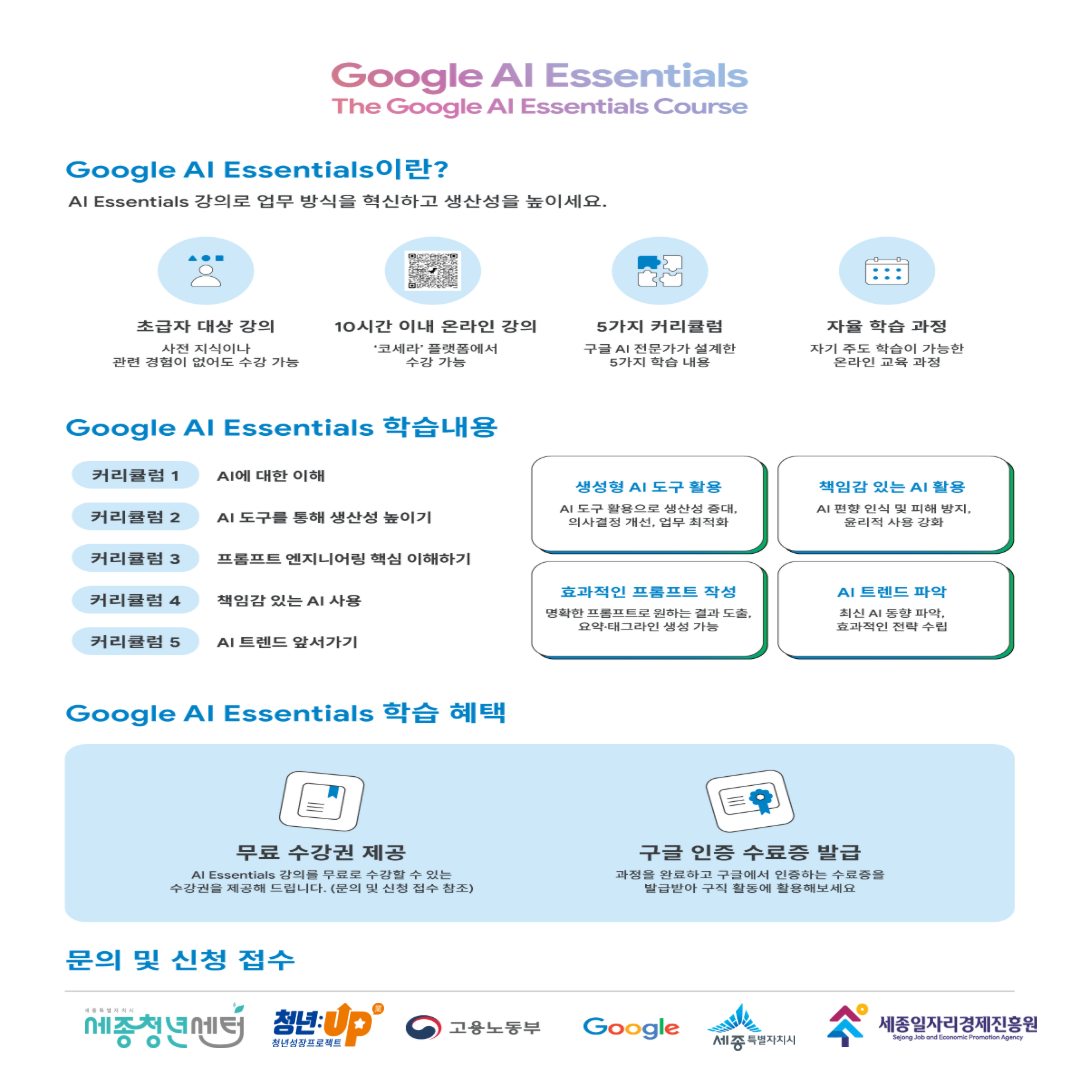| 정책 소개 | AI Essentials강의로 업무방식 혁신과 생산성을 높이기 위해 지원합니다. | 정책 내용 | *10월 13일 오전 10:09 기준으로 남은 라이센스는 95개(신청인원 233명) 남았습니다. 233명 세종청년센터 회원정보 이메일로 모두에게 수강권 배포하였습니다. 실제로 신청은 하였으나 가입 및 등록하지 않은 인원이 많습니다. 그렇기 때문에 참여인원이 초과하였더라도 수강권을 배포할 예정이니 참여신청하여 주시길 바랍니다. 수강권은 참여한 인원으로 카운팅되기 때문에 배포는 라이센스 종료까지 진행할 예정입니다. |