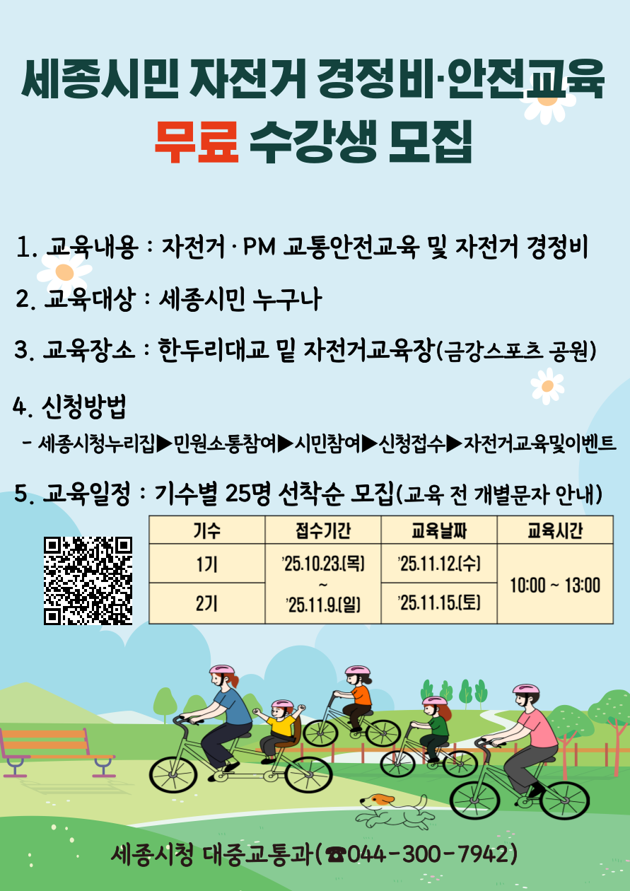 정책이름 2025년" 세종시민 자전거경정비·안전교육" 무료 수강생 모집 안내 정책 분야 안전