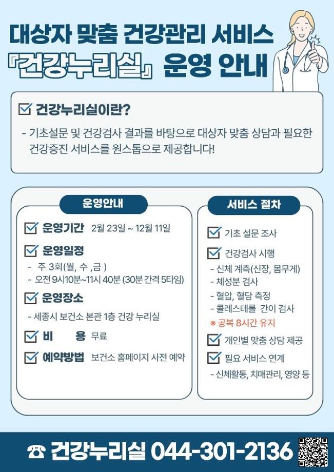 정책 소개 개인별 건강수준을 파악하고 맞춤형 건강 서비스를 제공하는 건강누리실을 운영 정책 내용 기초설문과 건강검사(혈압, 혈당, 콜레스테롤 등)를 바탕으로 대상자 맞춤 상담 제공 및 건강관리 서비스 연계