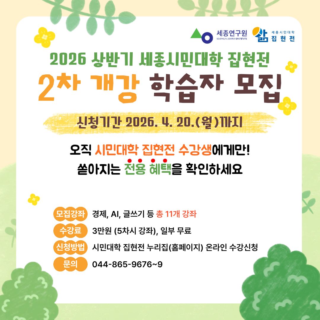 | 정책 소개 | 2026년 상반기 세종시민대학 집현전 2차 개강 학습자 모집 일정 안내 | 정책 내용 | 상세 내용 확인은 하단 '신청하러 갈래요' 클릭 후 해당 게시물 참조 부탁드립니다. |