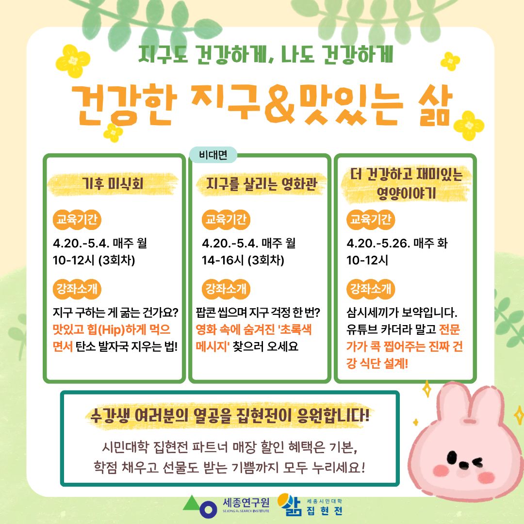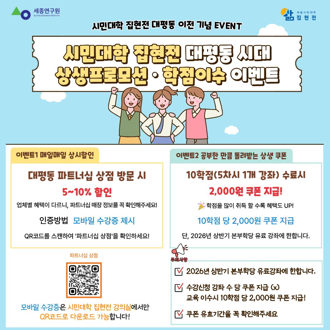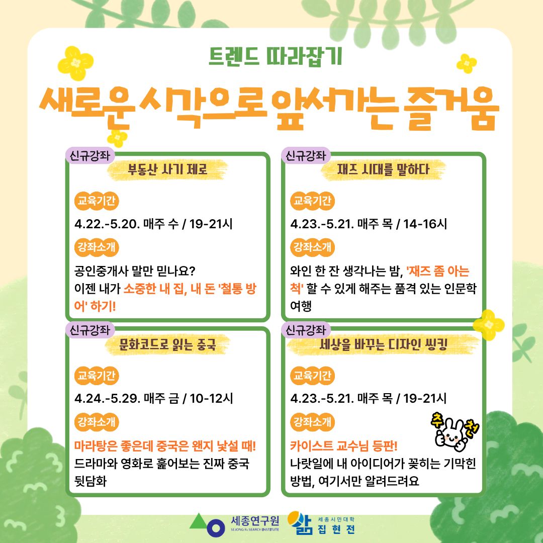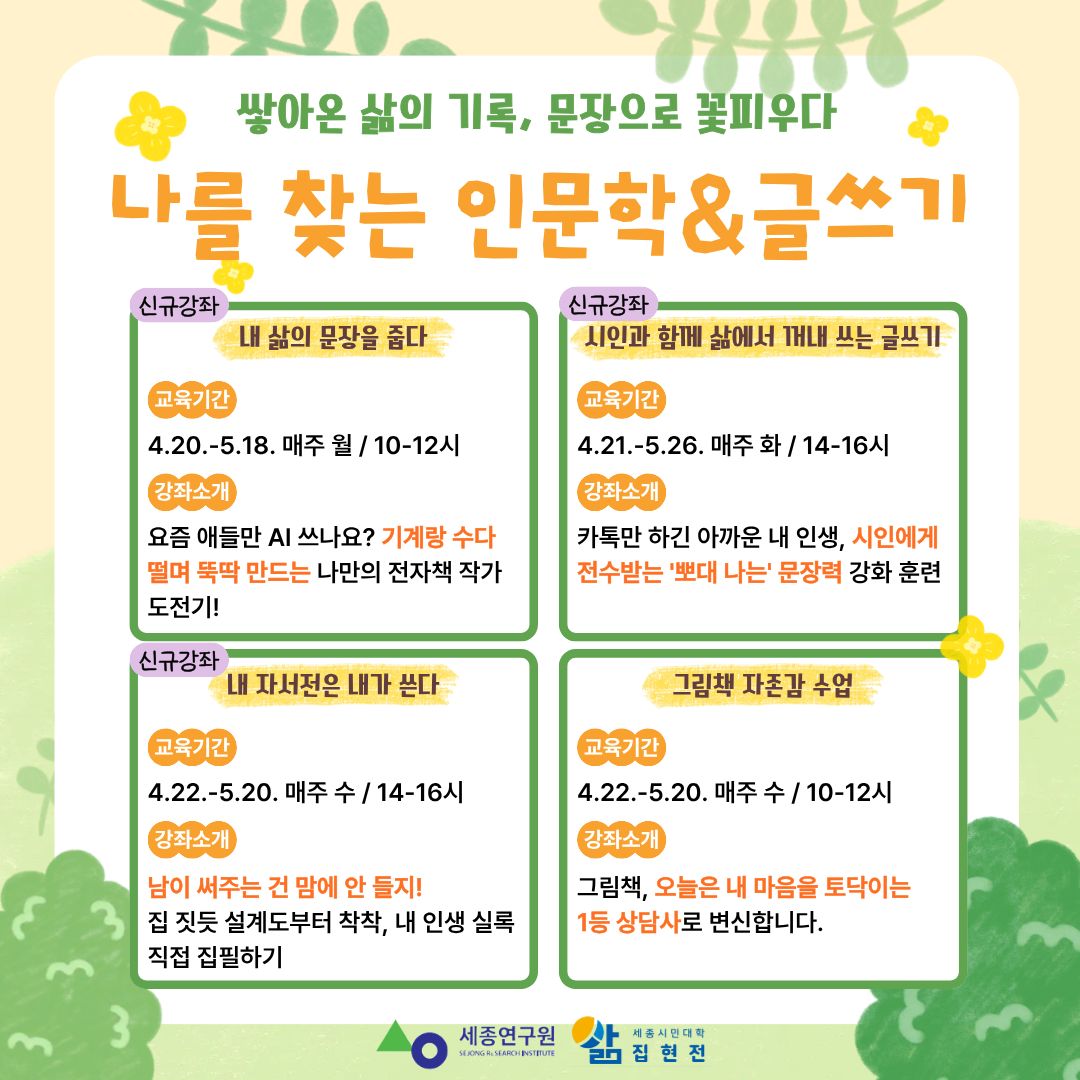 | 지원 기관 | 세종시민대학 집현전 | 신청 방법 | 세종시민대학 집현전 누리집을 통한 온라인 수강신청 (https://sjlms.sri.re.kr ▶ 회원가입 ▶ 로그인 ▶ 수강신청) |