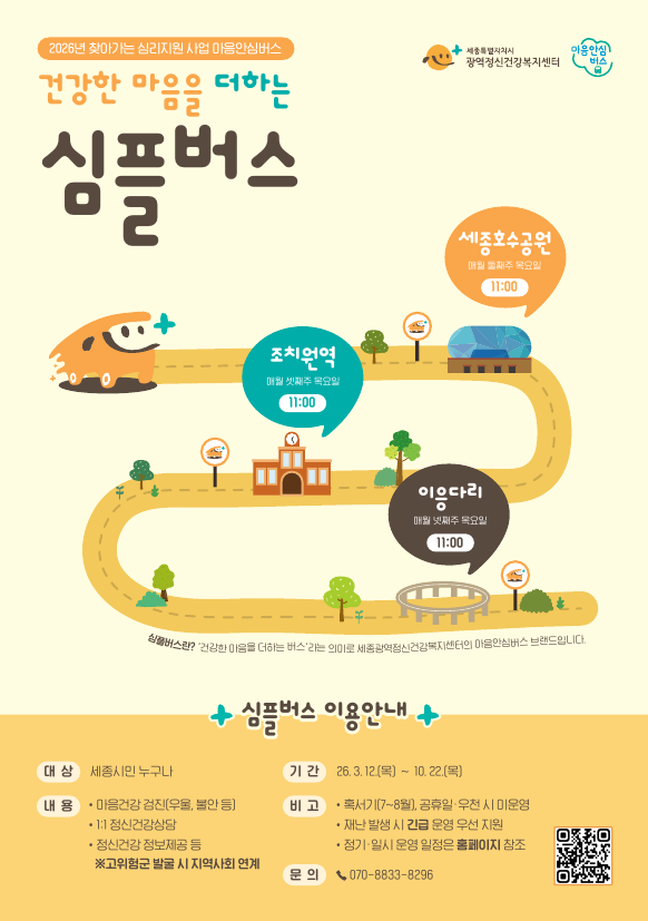 | 지원 규모 | * 심플버스 정류장 세종호수공원매월 2번째 목요일 11:00~13:00 조치원 역매월 3번째 목요일 11:00~13:00 이응다리매월 4번째 목요일 11:00~13:00 |