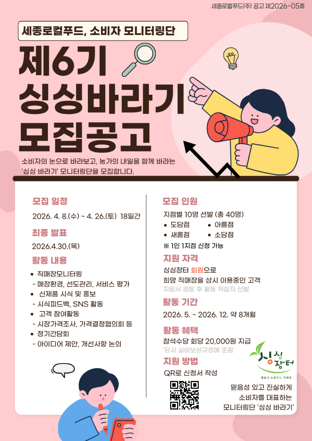 | 지원 기관 | 세종로컬푸드(주) 싱싱장터 | 신청 방법 | 포스터의 QR코드 인식하여 네이버 폼으로 https://naver.me/5jXWMrid 지원서 작성제출. |