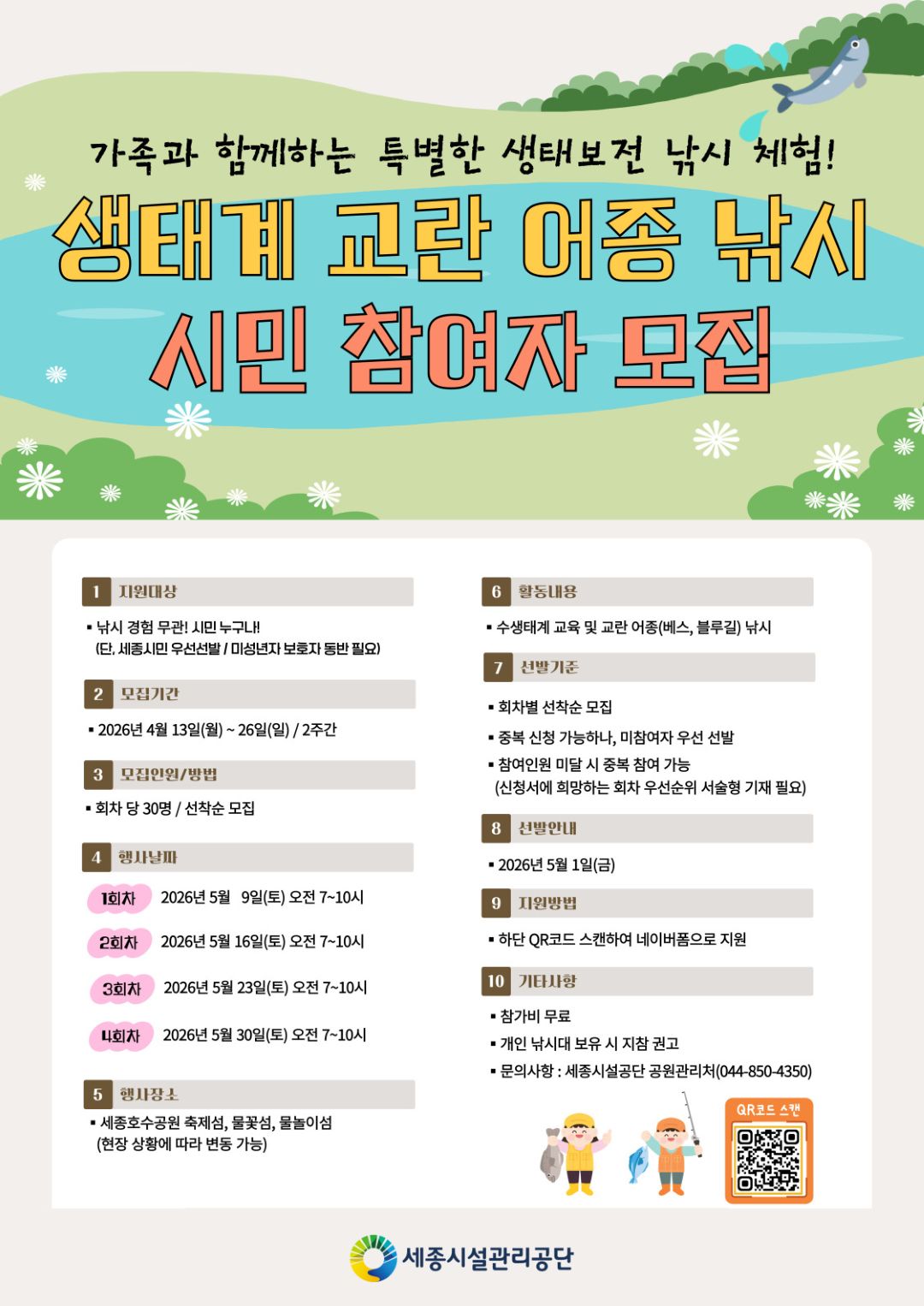 | 정책 소개 | 세종호수공원의 건강한 생태환경 조성을 위해 시민과 함께하는 생태계교란어종 낚시 참여행사 참가자를 모집합니다. 이번 행사는 생태계교란어종 제거를 통해 건강한 호수 생태계를 조성하고, 시민이 직접 환경보전에 참여하는 뜻깊은 체험의 장으로 운영됩니다. 포획한 어종은 일괄 수거 후 액체비료로 재활용 됩니다. 관심 있는 시민 여러분의 많은 참여를 바랍니다! |