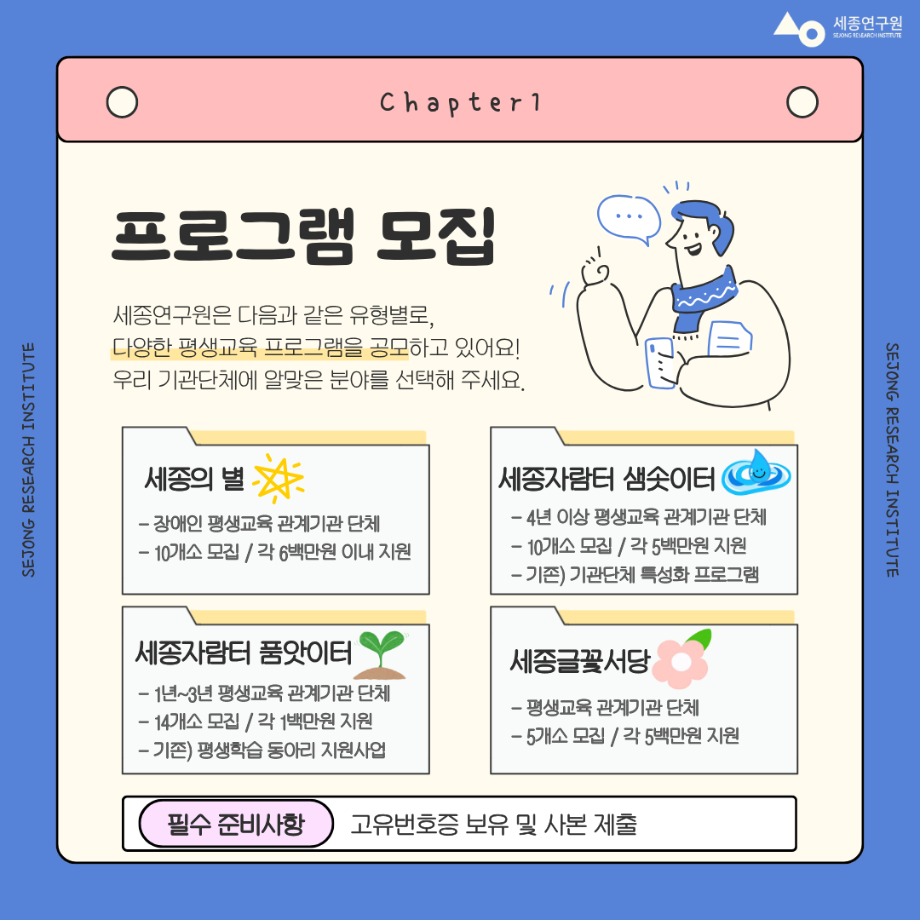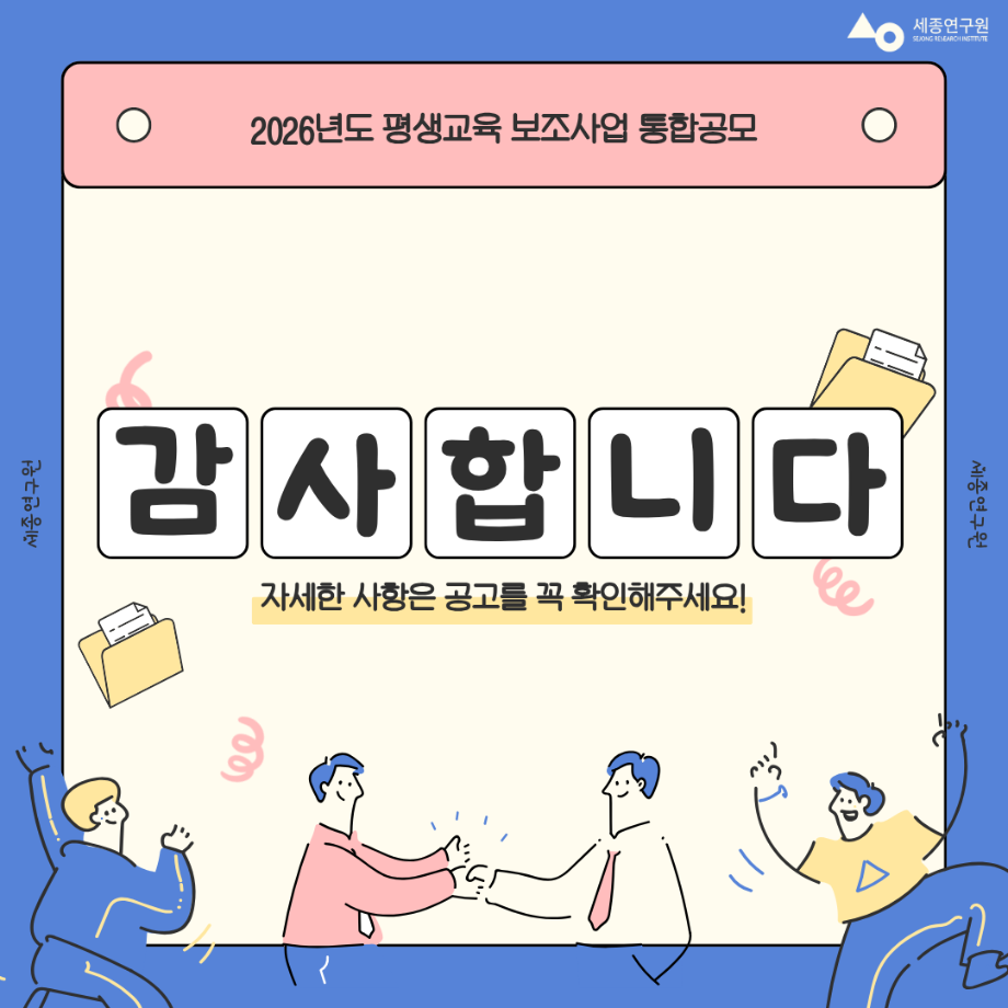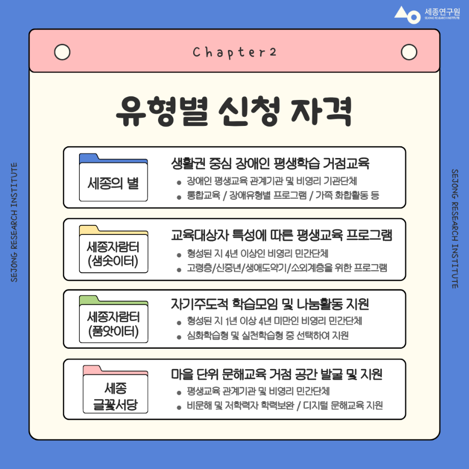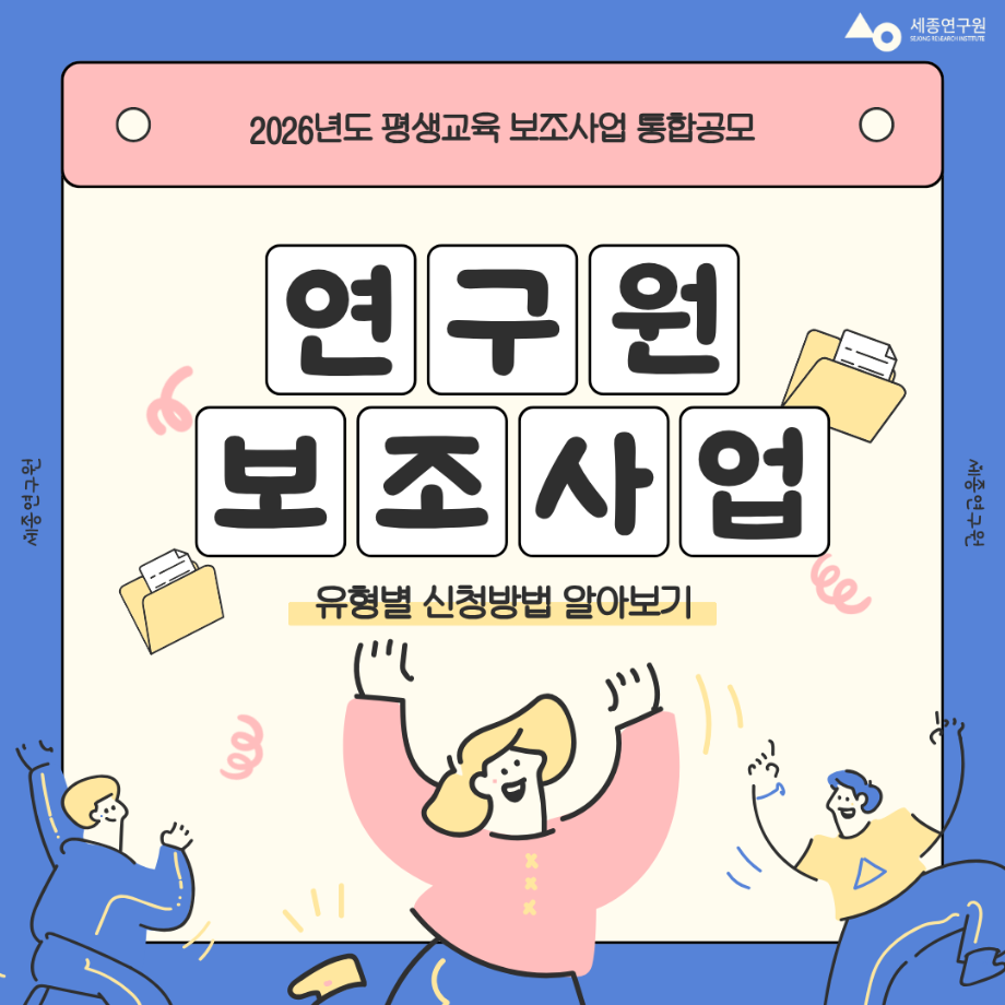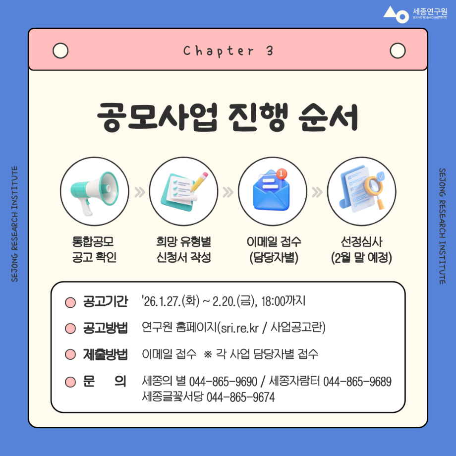 | 지원 기관 | 세종연구원 | 신청 방법 | 연구원 홈페이지 서류 작성 후 각 사업 담당자별 이메일 접수 |