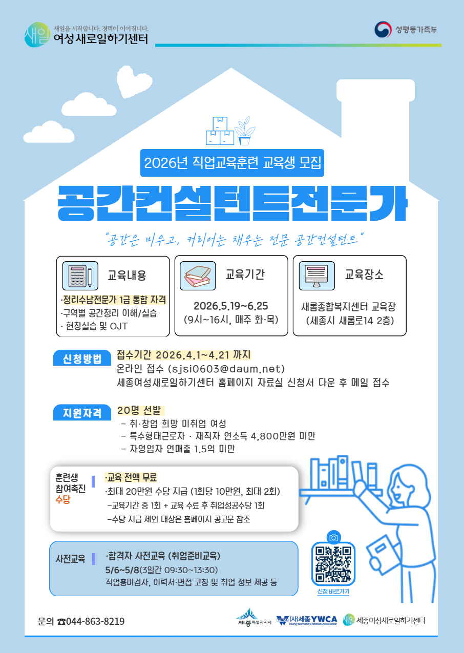 | 지원 기관 | 세종여성새로일하기센터 | 신청 방법 | * 사전 고용24(구워크넷) 구직신청 필수 - 고용24 구직신청 후 하단의 첨부파일 신청서 양식 이메일 제출 바랍니다.(구직신청시 여성새로일하기센터 정보제공동의 체크 필수!!) - 접수방법 : 이메일 (sjsi0603@hanmail.net) - 파일명에 본인 성함을 넣어 이메일 접수 부탁드립니다. (예시. 신청서 제출시 파일명 : 공간컨설턴트 신청서_홍길동) - 접수기간 : 2026년 4월 1일(수)~21일(화)까지 17:00 (이후 신청서는 인정되지 않음) - 지원자가 많을 경우 면접을 통해 최종 선발됩니다. (면접예정: 4월 29일 수요일 예정) |
