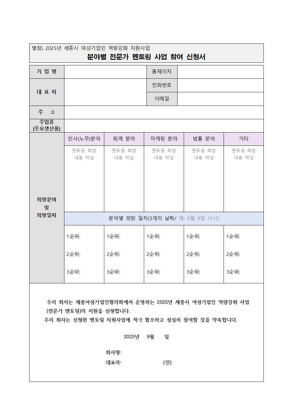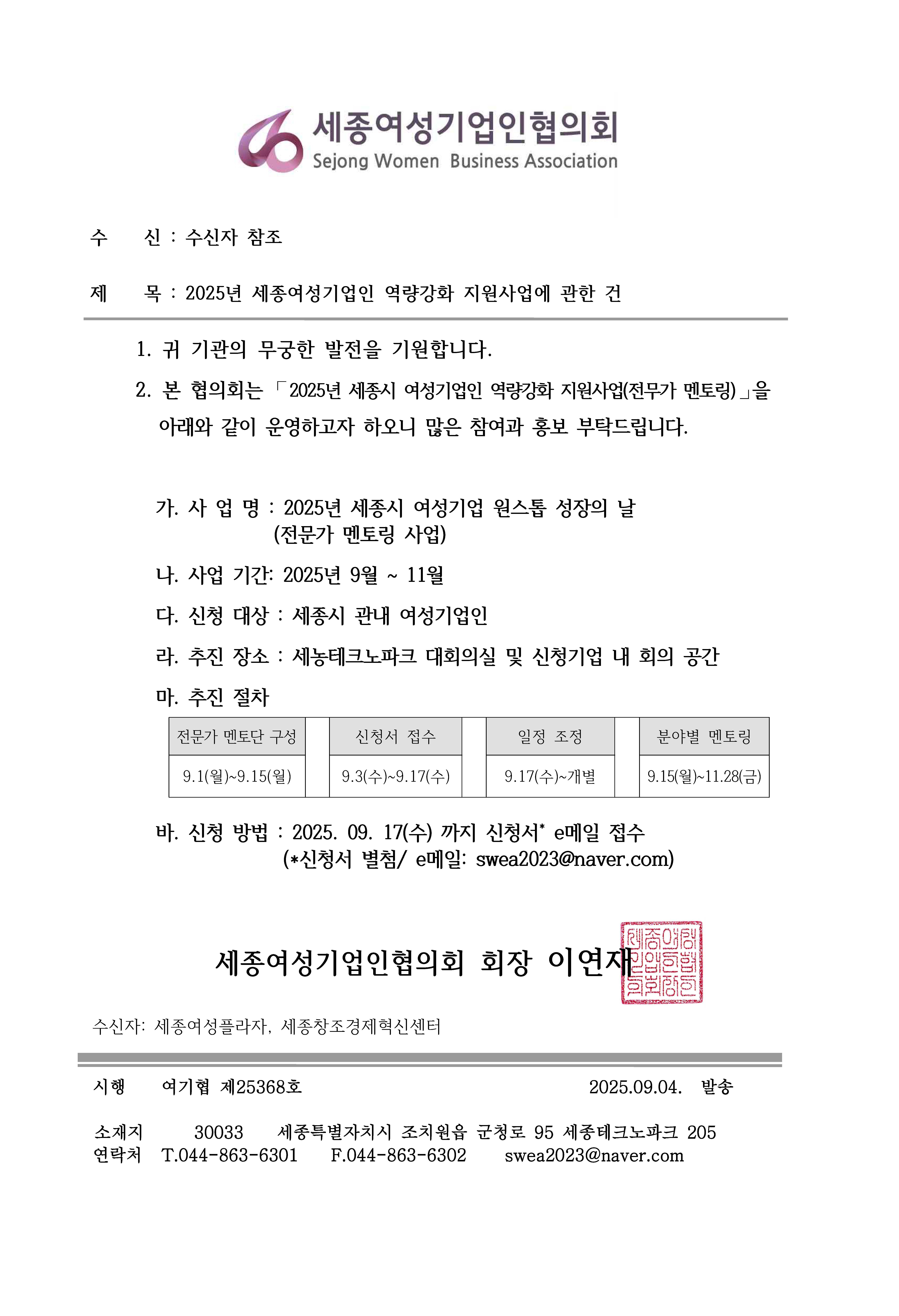 지원 기관 | 세종여성기업인협회 | 신청 방법 | 2025. 09. 17(수) 까지 신청서* e메일 접수 (*신청서 별첨/ e메일: swea2023@naver.com) |
