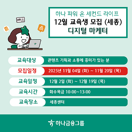 | 지원 기관 | 세종신중년센터 | 신청 방법 | 홈페이지 주소 : https://hana2nd.com 신청 후 전화 인터뷰를 통해 최종 교육생 선발이 됩니다. 선발 일정 : 11월 21일(금) ~ 11월 24일(월) 선발 확정 안내 : 11월 25일(화) ~18시 |