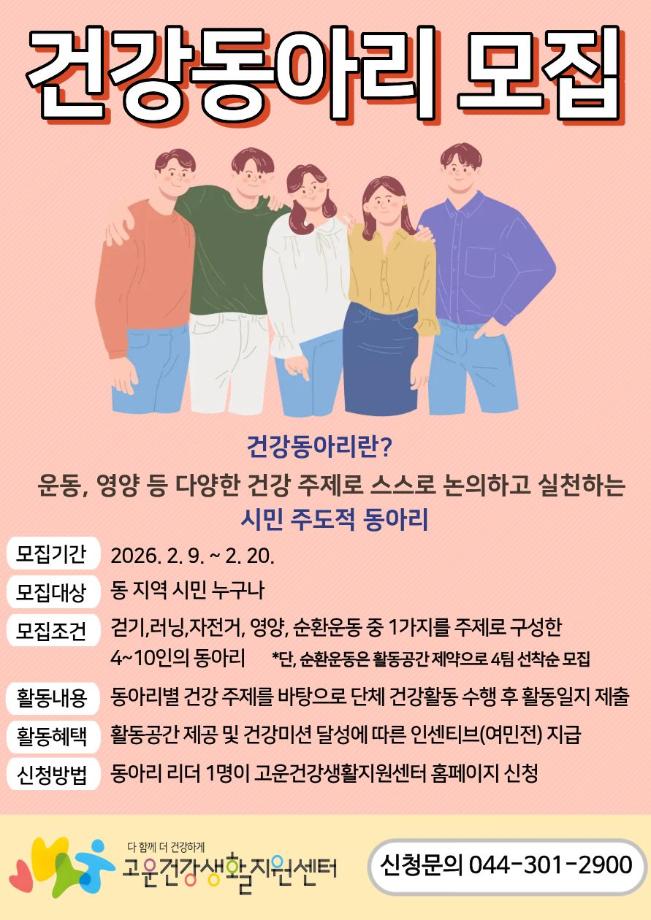 | 정책이름 | 2026년 고운건강생활지원센터 건강동아리 공개모집 | 정책 분야 | 건강 |