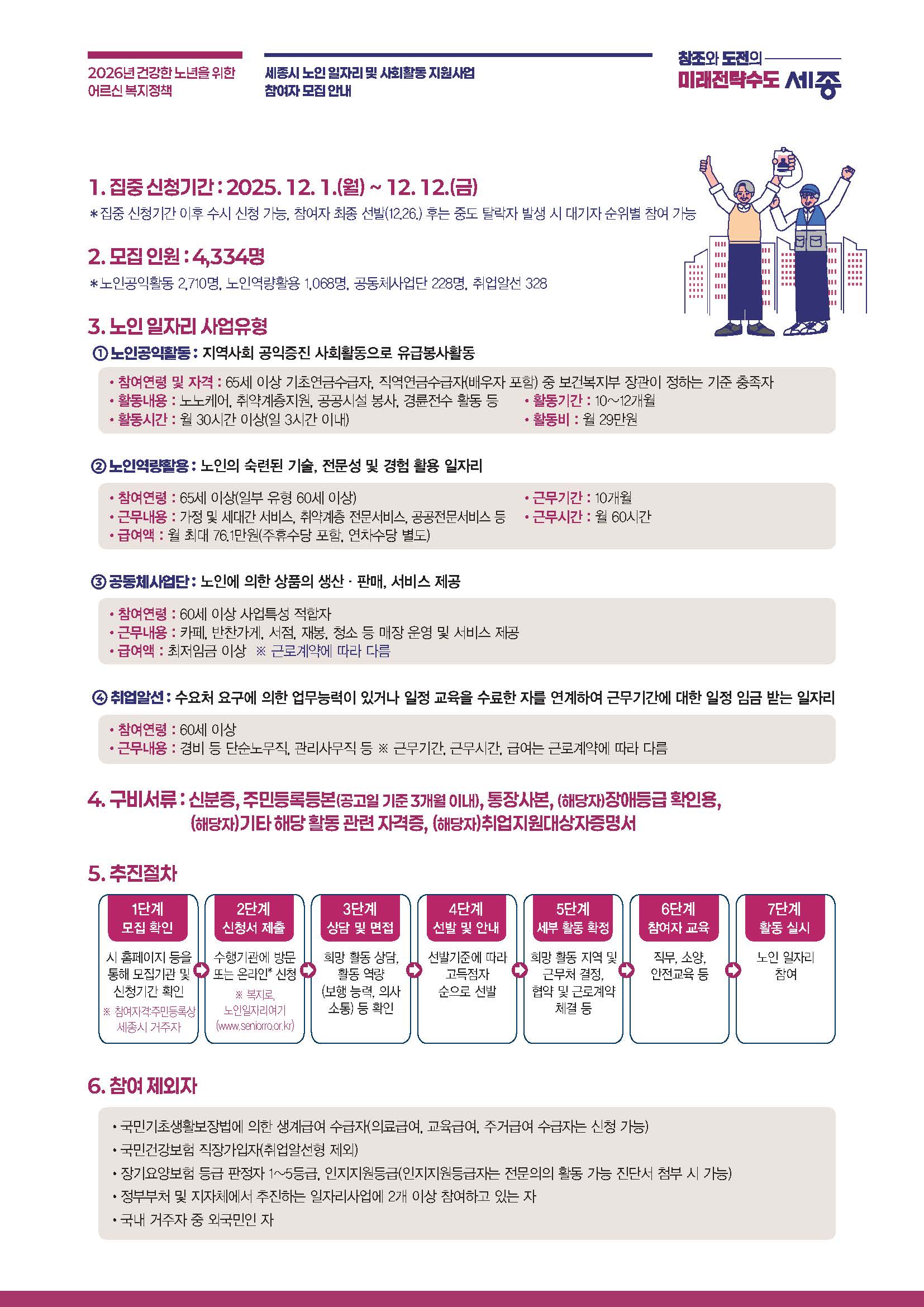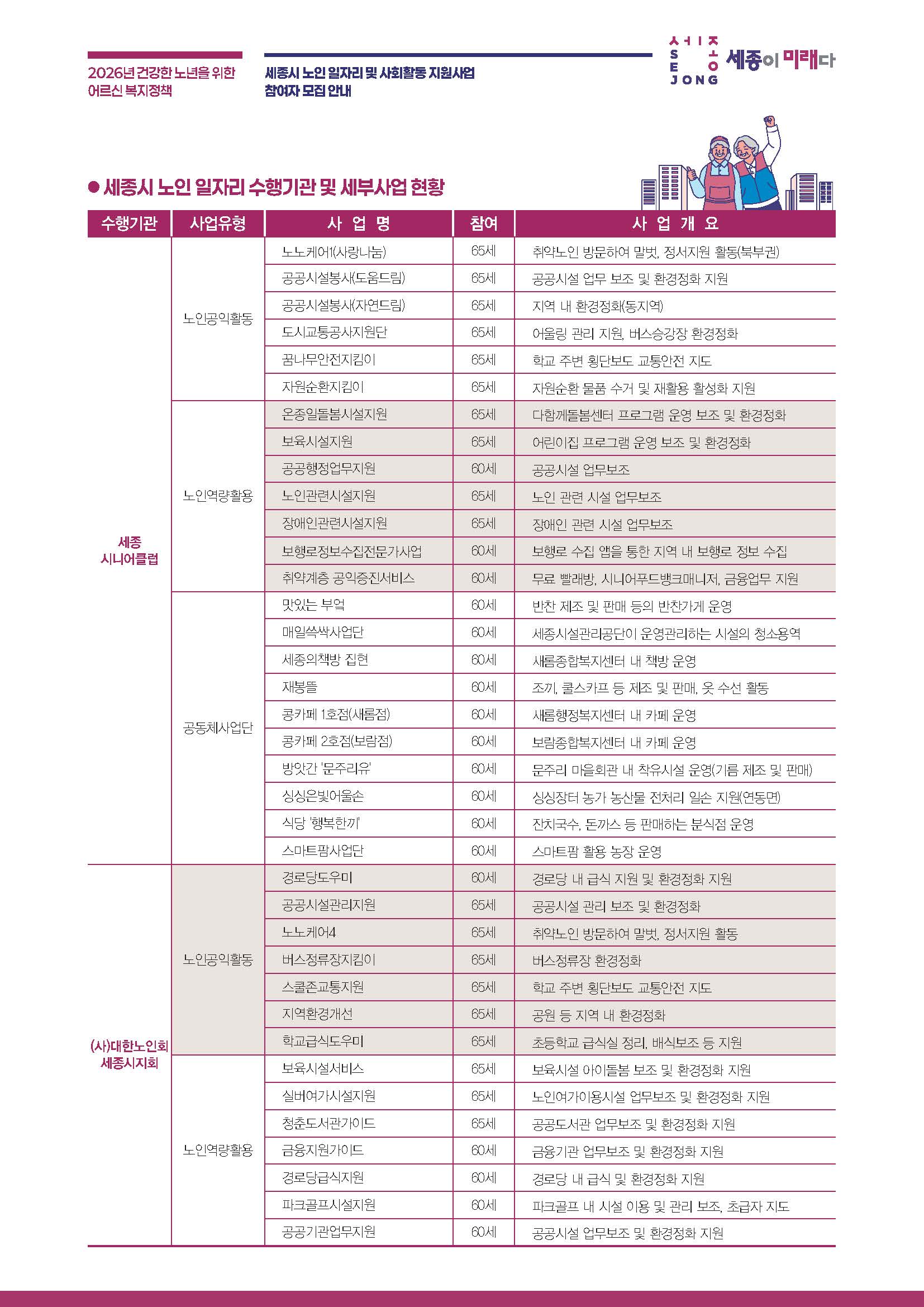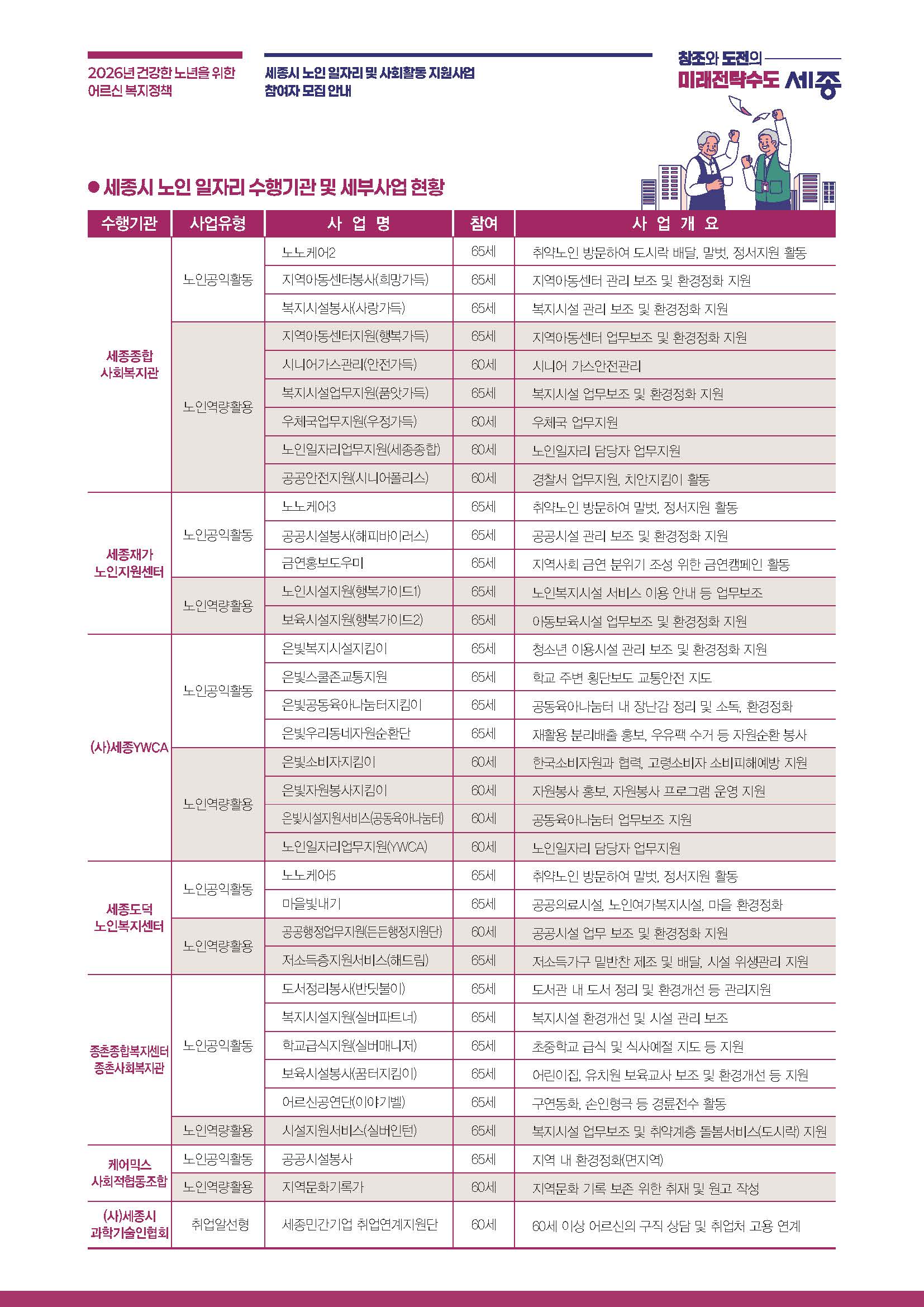 정책 소개 2026년 건강한 노년을 위한 어르신 복지정책 세종시 노인 일자리 및 사회활동 지원사업 정책 내용