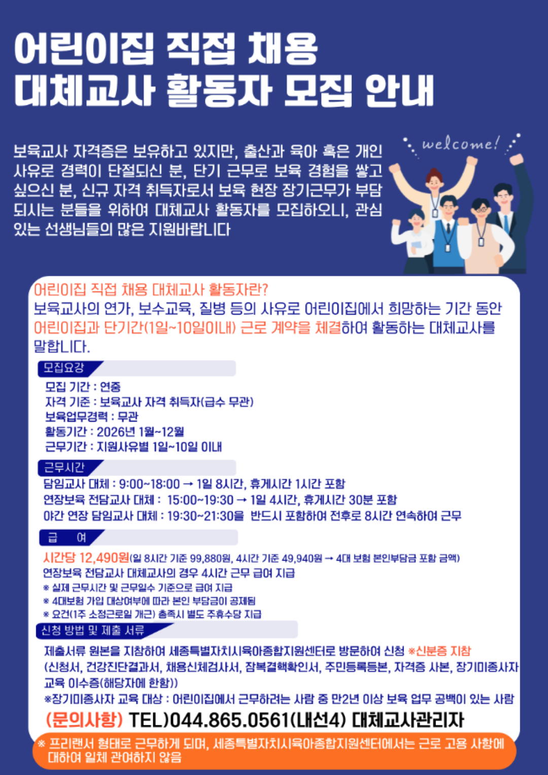 | 정책이름 | 어린이집 직접채용 대체교사 활동자 모집 | 정책 분야 | 교육 |