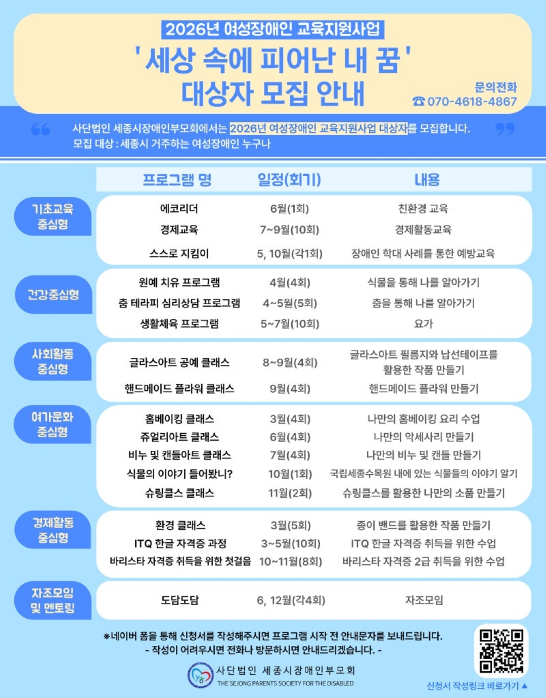 | 지원 기관 | 세종시장애인부모회 | 신청 방법 | 네이버 폼 작성 |