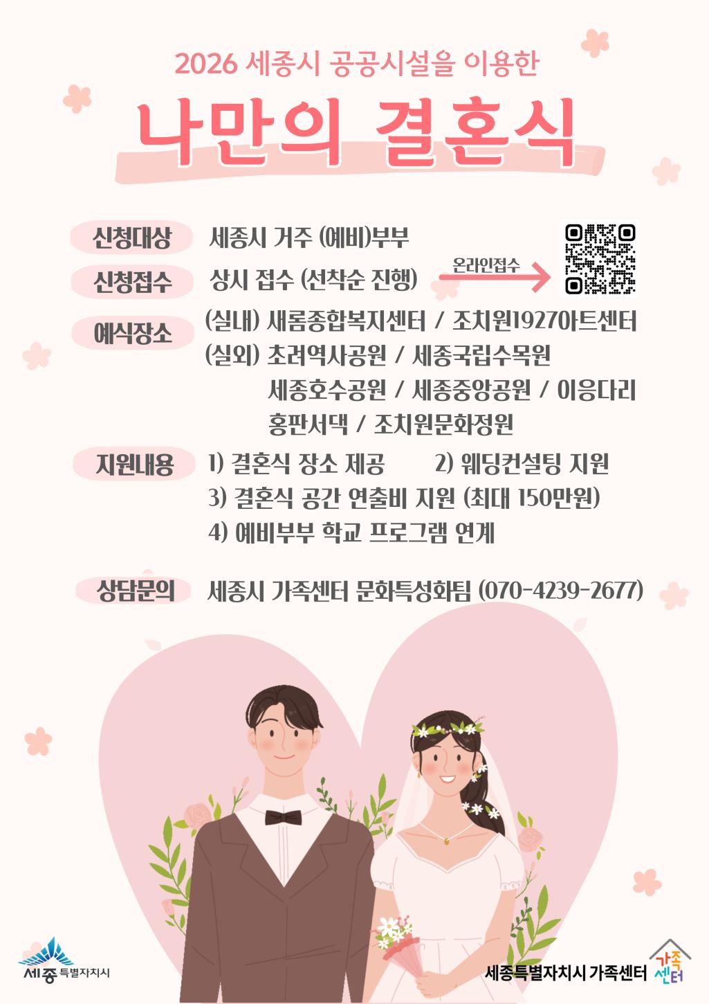 “2026 세종시 공공시설을 이용한 "나만의결혼식 "(온라인접수 및 상담 신청)” 정책과 키워드가 같은 정책을 찾았어요!