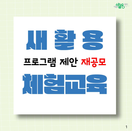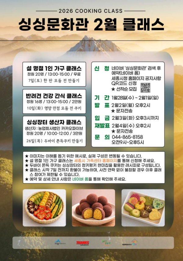 전체 379건 현재 페이지 2/64 카드리스트 검색 제목+내용 제목 내용 작성자 검색 2026년 새활용 체험교육 프로그램 제안 공모 작성일 2026.02.03 조회수 56 겨울방학 초등학생 대상 '미디어 교실' 프로그램 작성일 2026.01.30 조회수 62 2026년 싱싱문화관 2월 쿠킹 클래스 작성일 2026.01.28 조회수 73 2026년 "설날 연휴 꿈밥 꾸러미" 신청 작성일 2026.01.27 조회수 57 2026년 상반기 한국어 수업강좌 안내 작성일 2026.01.26 조회수 91 세종시민과 함께하는 글로벌 요리교실 작성일 2026.01.22 조회수 72 1 2 3 4 5 6 7 8 9 10 2 / 64