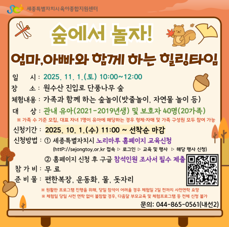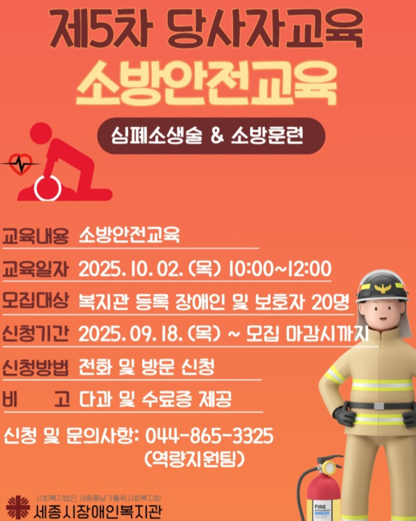 전체 334건 현재 페이지 4/56 카드리스트 검색 제목+내용 제목 내용 작성자 검색 [세종특별자치시장애인복지관]장애인당사자교육 "소방안전교육" 수강생 모집 작성일 2025.09.26 조회수 67 [세종특별자치시육아종합지원센터] 숲에서 놀자 「엄마·아빠와 함께하는 힐링타임... 작성일 2025.09.25 조회수 103 [세종로컬푸드(주)] 싱싱장터 어린이 중고장터 "오구오구 프리마켓" 판매자 모집 안내 작성일 2025.09.23 조회수 73 [세종시교육청 교육복지과] 세종 2생활권 마을교육지원센터 청소년 공론장‘2생마을... 작성일 2025.09.19 조회수 58 [한글문화도시센터] 2025 한글 국제 프레 비엔날레 전시 연계 워크숍 "예술-짓다"... 작성일 2025.09.17 조회수 63 [세종특별자치시교육청] 존중하고 배려하는 양성평등 문화조성 작성일 2025.09.12 조회수 93 1 2 3 4 5 6 7 8 9 10 4 / 56