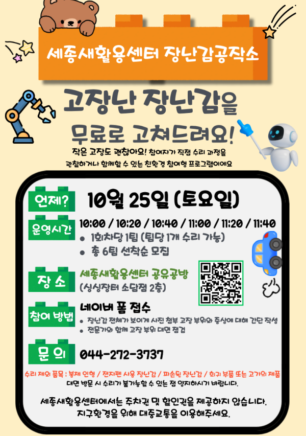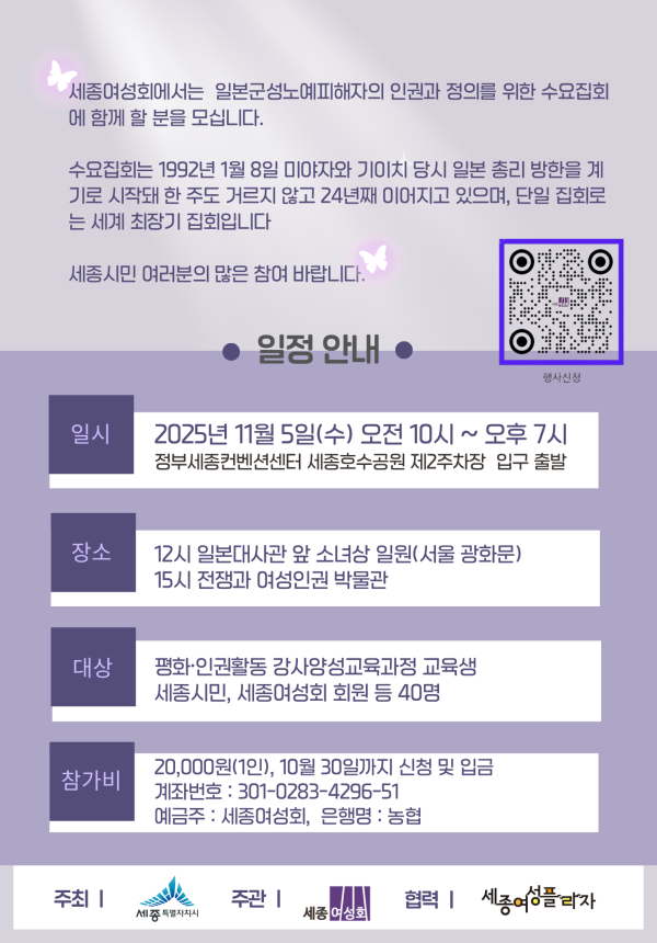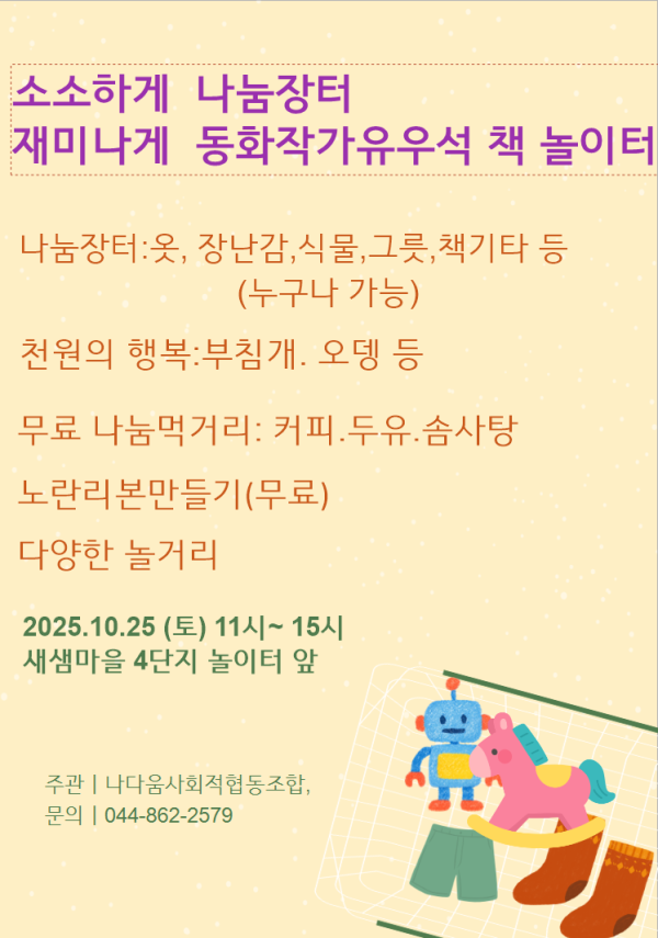 전체 362건 현재 페이지 6/61 카드리스트 검색 제목+내용 제목 내용 작성자 검색 [세종여성회] "수요집회 및 전쟁과 여성인권 박물관 견학" 참여자 모집 작성일 2025.10.20 조회수 114 [세종새활용센터] "고장난 장난감을 고쳐드려요" 행사안내 작성일 2025.10.17 조회수 72 [세종일자리경제진흥원] 2025년 "세종청년취업"박람회 작성일 2025.10.17 조회수 71 [세종일자리경제진흥원] " AI와 함께 일하는 시대, 나의 일(My Job), 우리의 내일(... 작성일 2025.10.17 조회수 80 [세종학생정신건강센터] 실수할 권리 '자율성과 주도성을 키우는 부모 역할' 작성일 2025.10.16 조회수 118 [나다움사회적협동조합] 소소하게 나눔장터 재미나게 동화작가 유우석 책 놀이터 작성일 2025.10.15 조회수 136 1 2 3 4 5 6 7 8 9 10 6 / 61