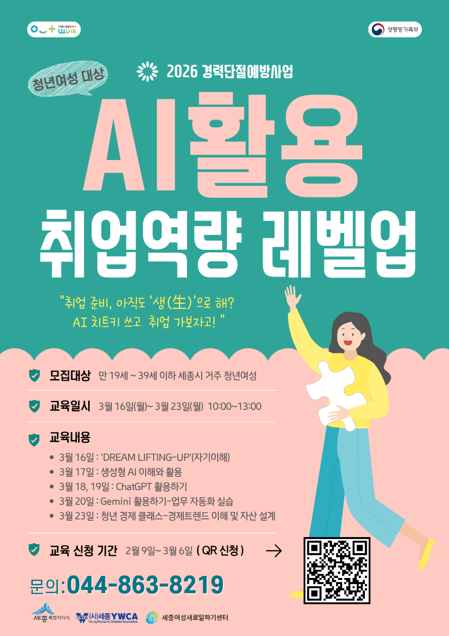 여성정책 > 기관단체 소식 여성정책 > 기관단체 소식 관한 표입니다. 청년여성 AI활용 취업역량 레벨업 작성자 공간매니저 작성일2026.02.10 조회수 14 ▶지원하기: https://docs.google.com/forms/d/e/1FAIpQLSd6LuXdb06YApTssynAH0RtAoEYB2hRLIhP9pWMwTAA2smJug/viewform 첨부파일 1212548810_2026_ECB2ADEB85842028129.png (168.5 KB) 목록으로