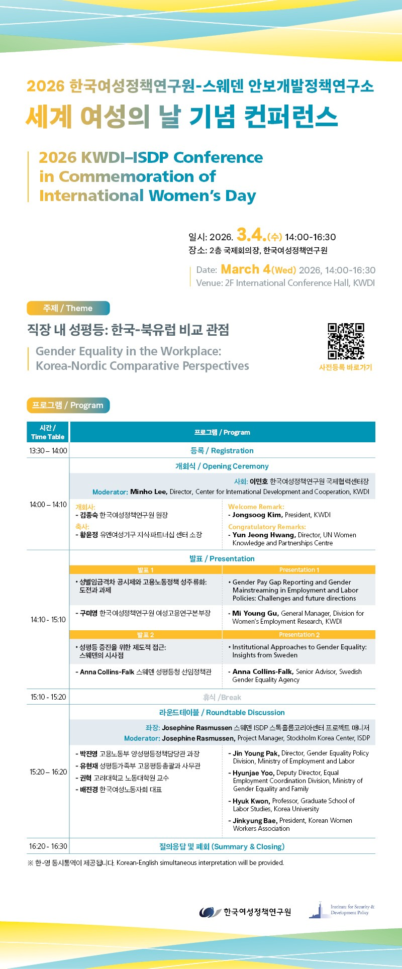 여성정책 > 기관단체 소식 여성정책 > 기관단체 소식 관한 표입니다. 2026 세계 여성의 날 기념 컨퍼런스 작성자 공간매니저 작성일2026.02.12 조회수 8 ▶사전등록: https://docs.google.com/forms/d/e/1FAIpQLSdTUVjrJEQ4ENjQHKA5BVHLHN9EPg92JmwugJWsn6VTbMfTzA/viewform 첨부파일 KakaoTalk_20260212_134843978.png (945.0 KB) 목록으로