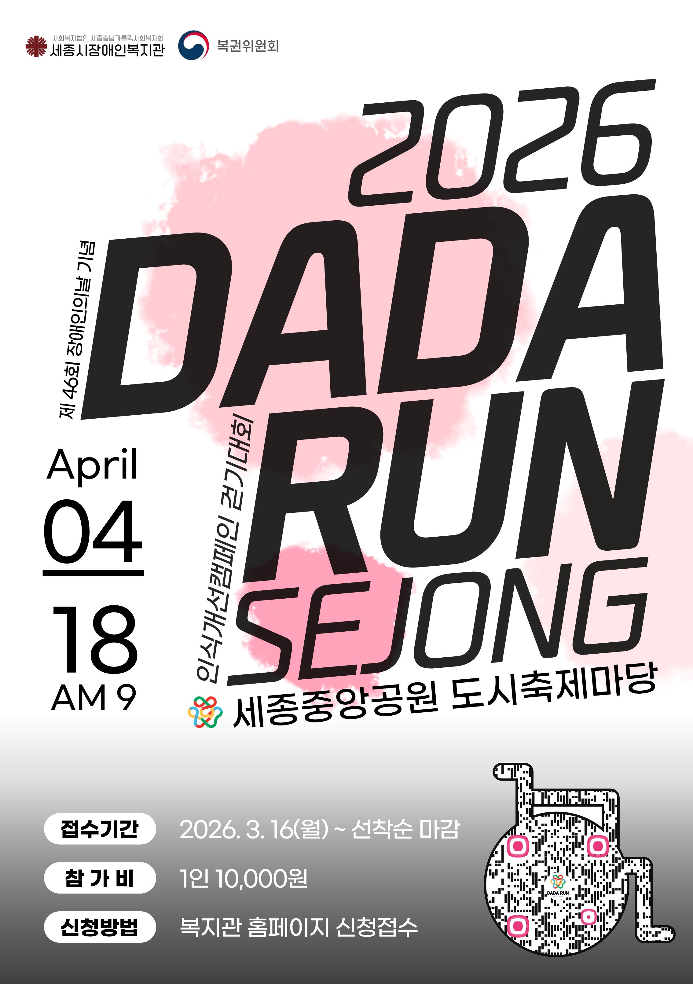 세종시장애인복지관에서는 제46회 장애인의 날을 기념하여 세종시민의 장애인식개선을 위해 2026년 장애인식개선 캠페인 걷기대회 「DADARUN SEJONG」 '를 개최하오니 시민분들의 많은 신청과 참여 부탁드립니다.