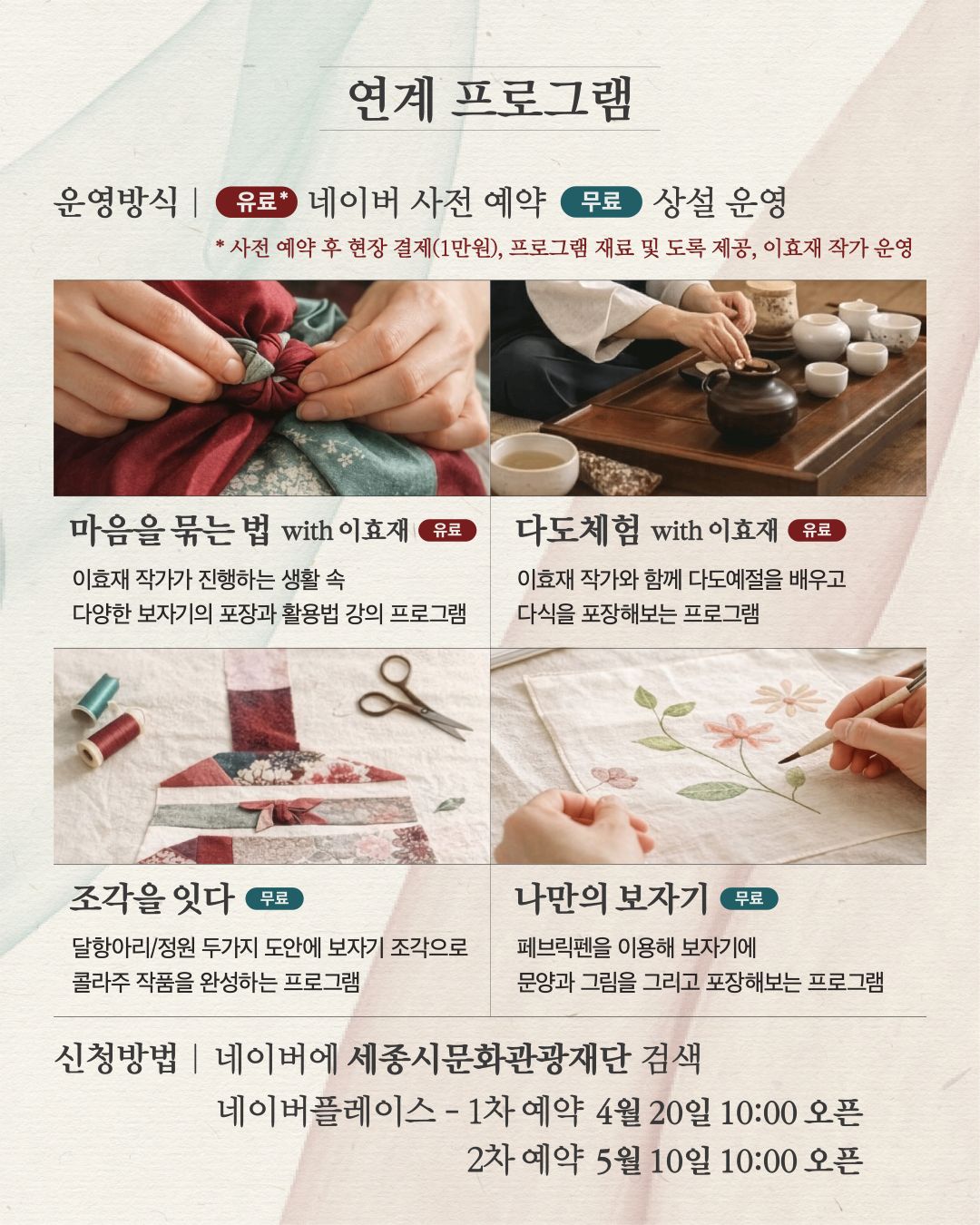또한 대한민국 1호 보자기 아티스트 이효재가 직접 운영하는 전시 연계 체험 프로그램을 통해, 보자기의 형식과 쓰임을 보다 깊이 있게 경험할 수 있습니다. * 프로그램 신청 링크 : 네이버 플레이스 (클릭)