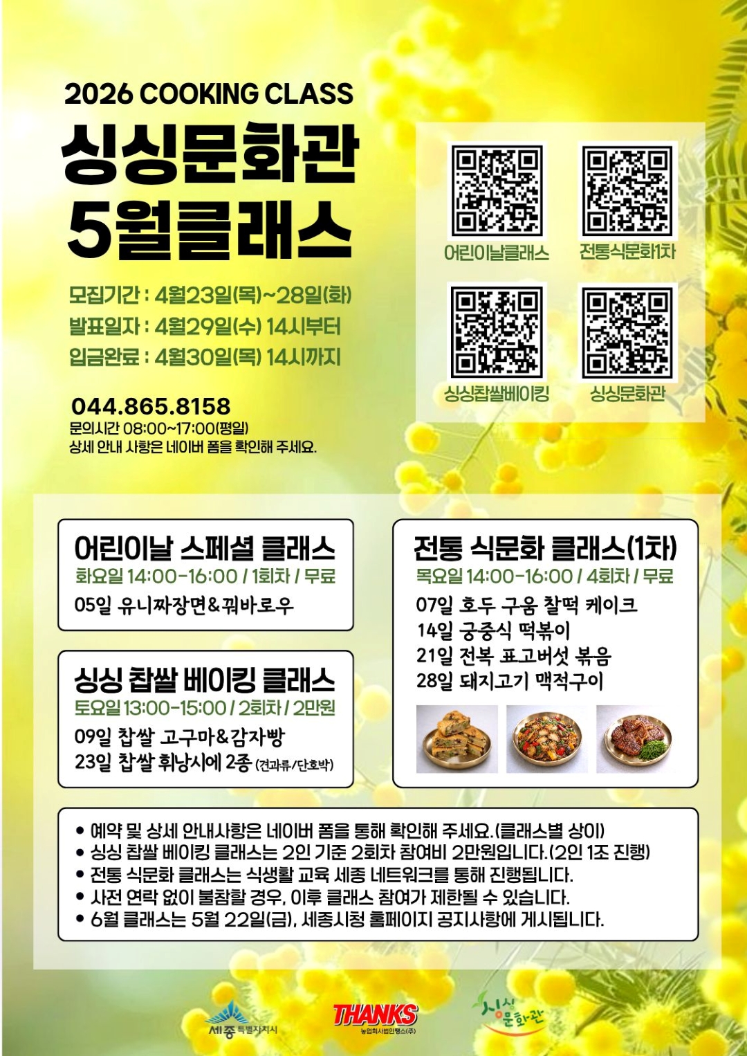 ▶ 상세내용확인 : 해당게시물 바로가기(클릭) / 어린이날 클래스신청(클릭) / 싱싱찹쌀베이킹 신청(클릭) / 전통 식문화1차 신청(클릭) 문의처 : 044-865-8158 (평일 8시 ~ 15시)