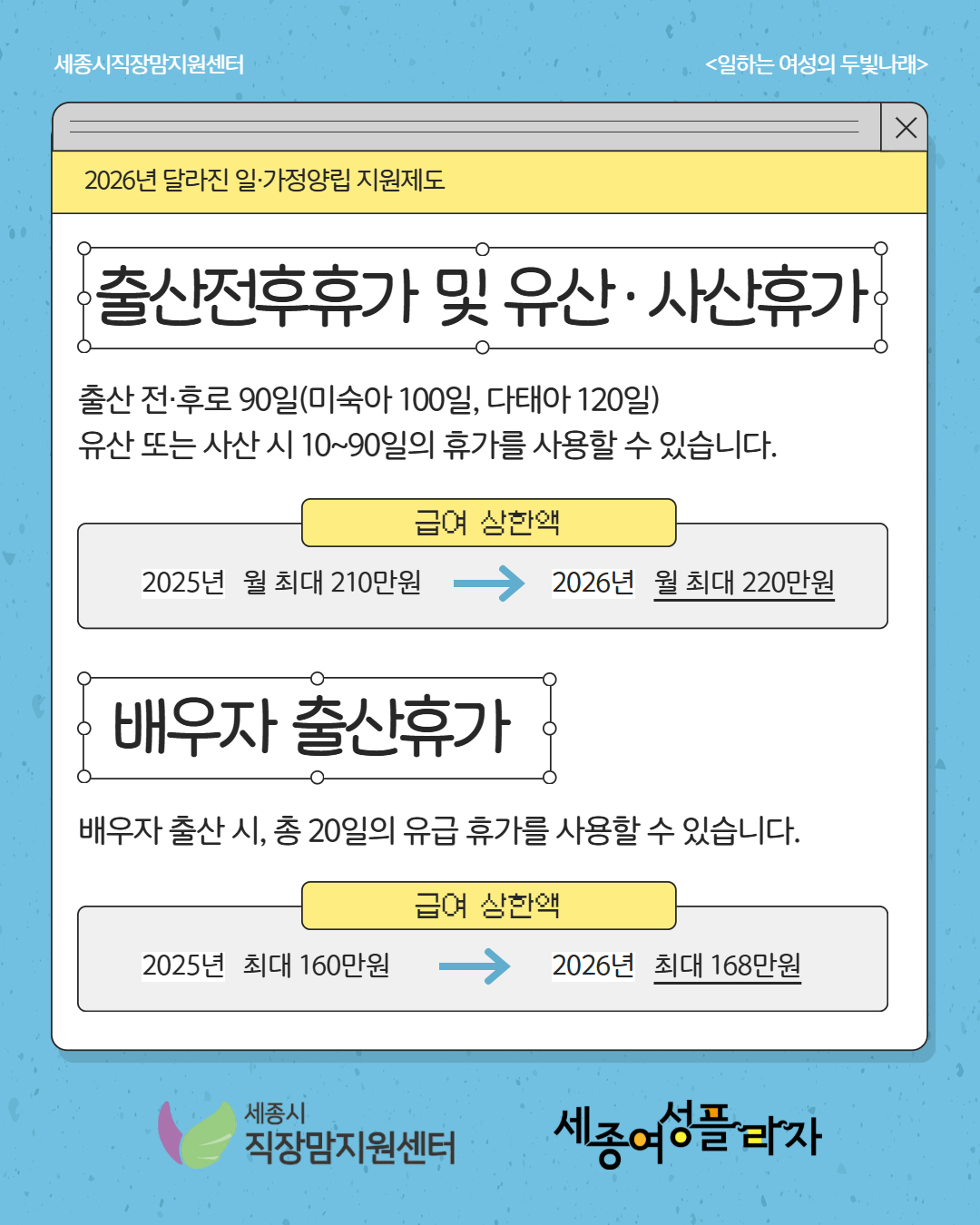 일,생활균형소식 일,생활균형소식 관한 표입니다. [임신]2026 달라진 일가정양립지원제도_노동자 편 작성자 관리자 작성일2026.03.23 조회수 58 - 공지사항 입니다. 첨부파일 1.jpg (532.9 KB) 2.jpg (443.5 KB) 3.jpg (423.7 KB) 4.jpg (449.9 KB) 목록으로 다음글 2026 달라진 일가정양립지원제도_사업주 편 이전글 2026 고용보험 미적용자 출산급여 주요 변경 사항