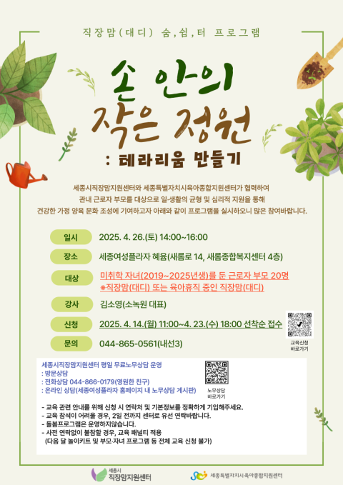 교육신청 안내 교육신청 전 안내사항을 필독해주시기 바랍니다. 전체 교육 사업 직장맘 전체 39건 현재 페이지 1/2 공지사항 검색 제목+내용 제목 내용 검색 교육종료 직장맘 [직장맘 숨,쉼,터] 둥글게 엮는 마음 : 크리스마스 리스 만들기 교육기간 2025.12.13 ~ 2025.12.13 모집기간 2025.11.26 ~ 2025.12.04 모집방법 관리자 승인 모집상태 교육종료 51/24 신청인/정원 교육종료 교육종료 직장맘 [역량강화] AI로 잇는 일과 삶 교육기간 2025.12.13 ~ 2025.12.13 모집기간 2025.11.26 ~ 2025.12.10 모집방법 관리자 승인 모집상태 교육종료 17/20 신청인/정원 교육종료 교육종료 직장맘 [자녀소통] 어디서부터 얘기해야 할까요? : 우리집 성교육 첫걸음(아동기) 교육기간 2025.12.04 ~ 2025.12.04 모집기간 2025.11.17 ~ 2025.12.04 모집방법 선착순 모집 모집상태 교육종료 13/24 신청인/정원 교육종료 교육종료 직장맘 [자녀소통] 어디서부터 얘기해야 할까요? : 우리집 성교육 첫걸음(영유아기) 교육기간 2025.12.03 ~ 2025.12.03 모집기간 2025.11.17 ~ 2025.12.03 모집방법 선착순 모집 모집상태 교육종료 12/24 신청인/정원 교육종료 교육종료 직장맘 [직장맘 숨,쉼,터] 빛으로 그리는 마음 : 글라스아트 교육기간 2025.11.15 ~ 2025.11.15 모집기간 2025.11.03 ~ 2025.11.09 모집방법 관리자 승인 모집상태 교육종료 34/20 신청인/정원 교육종료 교육종료 직장맘 [자녀소통] 아빠가 맞춰보는 아이 마음 퍼즐 : 에니어그램으로 알아보는 아빠-자녀 소통 교육기간 2025.11.15 ~ 2025.11.15 모집기간 2025.10.27 ~ 2025.11.12 모집방법 관리자 승인 모집상태 교육종료 0/0 신청인/정원 교육종료 교육종료 직장맘 [역량강화] AI로 잇는 일과 삶 교육기간 2025.10.28 ~ 2025.11.04 모집기간 2025.10.14 ~ 2025.10.26 모집방법 선착순 모집 모집상태 교육종료 24/20 신청인/정원 교육종료 교육종료 직장맘 [직장맘 숨,쉼,터] 몸과 마음의 온 쉼 : 아로마테라피, 명상요가 교육기간 2025.10.25 ~ 2025.10.25 모집기간 2025.10.13 ~ 2025.10.24 모집방법 관리자 승인 모집상태 교육종료 14/20 신청인/정원 교육종료 교육종료 직장맘 [직장맘 숨,쉼,터] 색으로 채우는 마음 : 오일파스텔 교육기간 2025.09.27 ~ 2025.09.27 모집기간 2025.09.08 ~ 2025.09.24 모집방법 관리자 승인 모집상태 교육종료 21/20 신청인/정원 교육종료 교육종료 직장맘 [역량강화] 함께하는 우리 집 : 집안일 카드 100장으로 서로 돌보는 우리 집 만들기 교육기간 2025.09.27 ~ 2025.10.18 모집기간 2025.09.11 ~ 2025.09.26 모집방법 관리자 승인 모집상태 교육종료 12/12 신청인/정원 교육종료 교육종료 직장맘 [역량강화] 일과 돌봄 사이 : 건강한 양육자가 되기 위한 나의 회복탄력성 알아보기 교육기간 2025.09.18 ~ 2025.09.18 모집기간 2025.09.01 ~ 2025.09.17 모집방법 관리자 승인 모집상태 교육종료 18/25 신청인/정원 교육종료 교육종료 직장맘 [직장맘 숨,쉼,터] 취향을 심는 화분 : 힙팟 만들기 교육기간 2025.08.23 ~ 2025.08.23 모집기간 2025.07.28 ~ 2025.08.15 모집방법 관리자 승인 모집상태 교육종료 17/10 신청인/정원 교육종료 교육종료 직장맘 [노동법 교육] 손으로 새기는 나의 이름 : 노동법 교육&수제도장 만들기 교육기간 2025.07.19 ~ 2025.07.19 모집기간 2025.07.02 ~ 2025.07.16 모집방법 관리자 승인 모집상태 교육종료 28/20 신청인/정원 교육종료 교육종료 직장맘 [직장맘 숨,쉼,터] 꽃으로 담는 여름 : 화병 꽃꽂이 교육기간 2025.07.12 ~ 2025.07.12 모집기간 2025.06.30 ~ 2025.07.04 모집방법 관리자 승인 모집상태 교육종료 27/10 신청인/정원 교육종료 교육종료 직장맘 [직장맘 숨,쉼,터] 향기로 여는 감정의 창 : 감정오일 향수 만들기 교육기간 2025.06.21 ~ 2025.06.21 모집기간 2025.06.04 ~ 2025.06.13 모집방법 관리자 승인 모집상태 교육종료 30/20 신청인/정원 교육종료 교육종료 직장맘 [직장맘 숨,쉼,터] 손으로 엮는 즐거움 : 텀블러 가방 만들기 교육기간 2025.05.17 ~ 2025.05.17 모집기간 2025.05.05 ~ 2025.05.15 모집방법 관리자 승인 모집상태 교육종료 11/15 신청인/정원 교육종료 교육종료 직장맘 [직장맘 숨,쉼,터] 손 안의 작은 정원 : 테라리움 만들기 교육기간 2025.04.26 ~ 2025.04.26 모집기간 2025.04.14 ~ 2025.04.25 모집방법 관리자 승인 모집상태 교육종료 4/20 신청인/정원 교육종료 교육종료 직장맘 [직장맘 숨,쉼,터] 나를 품다, 피우다 : 육아휴직자 정서지원을 위한 연극치료 프로그램 교육기간 2025.04.08 ~ 2025.04.08 모집기간 2025.03.24 ~ 2025.04.03 모집방법 관리자 승인 모집상태 교육종료 6/10 신청인/정원 교육종료 교육종료 직장맘 [직장맘 숨,쉼,터] 몽글몽글 거품 속 쉼 : 비건 샴푸바, 입욕제 만들기 교육기간 2025.03.22 ~ 2025.03.22 모집기간 2025.03.10 ~ 2025.03.19 모집방법 관리자 승인 모집상태 교육종료 25/20 신청인/정원 교육종료 교육종료 직장맘 [2탄] 2025 달라지는 모성보호제도 알기와 다도&다식 체험 교육기간 2024.12.14 ~ 2024.12.14 모집기간 2024.11.22 ~ 2024.12.13 모집방법 관리자 승인 모집상태 교육종료 21/20 신청인/정원 교육종료 1 2 1 / 2