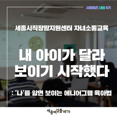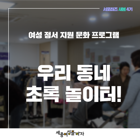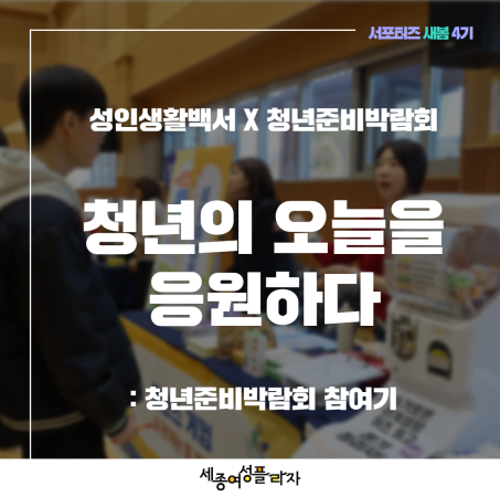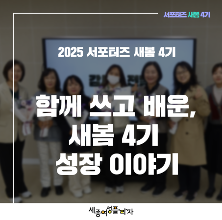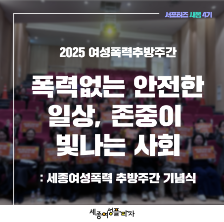 전체 236건 현재 페이지 1/40 카드리스트 검색 제목+내용 제목 내용 작성자 검색 [세종여성플라자 새봄_2025 서포터즈 새봄 4기] 함께 쓰고 배운, 새봄 4기 성장 이... 작성일 2025.12.04 조회수 41 [세종여성플라자 새봄_성인생활백서×청년준비박람회] 청년의 오늘을 응원하다 : 청... 작성일 2025.12.04 조회수 36 [세종여성플라자 새봄_2025 여성폭력 추방주간] 폭력없는 안전한 일상, 존중이 빛... 작성일 2025.12.02 조회수 37 [세종여성플라자 새봄_2025 세종시 여성일자리 박람회] 세종시 여성들의 일과 생활... 작성일 2025.11.24 조회수 62 [세종여성플라자 새봄_자녀소통교육] 내 아이가 달라 보이기 시작했다 : ‘나’를 알... 작성일 2025.11.19 조회수 51 [세종여성플라자 새봄_여성정서지원문화프로그램] 우리 동네 초록 놀이터! 작성일 2025.11.18 조회수 50 1 2 3 4 5 6 7 8 9 10 1 / 40