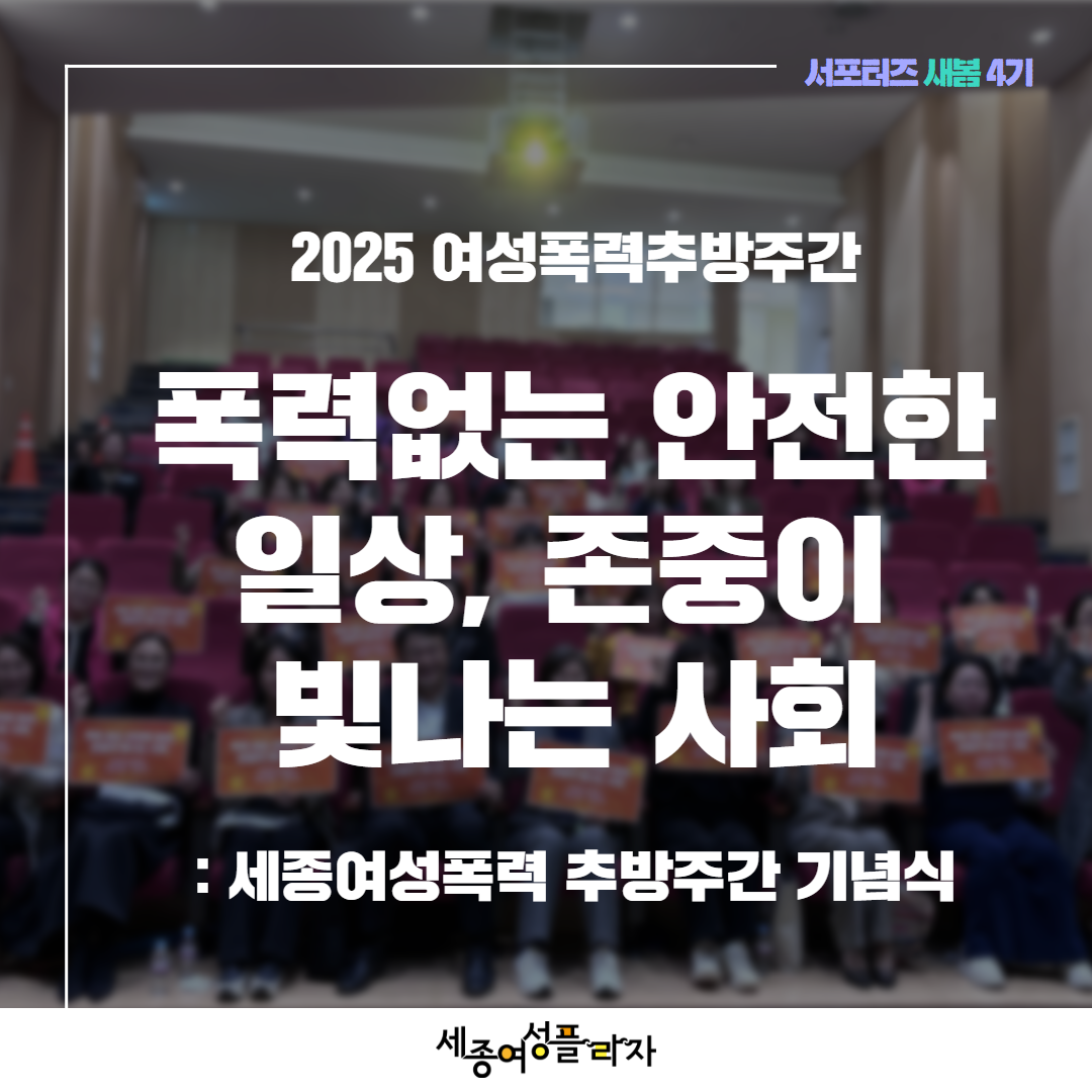 ![]() 서포터즈 새봄 4기 [2025 세종여성폭력추방주간 기념식] 폭력 없는 안전한 일상, 존중이 빛나는 사회! 내용을 확인하고 싶다면??