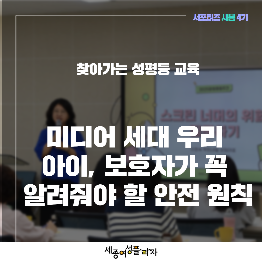 ![]() 서포터즈 새봄 4기 [찾아가는 성평등 교육] 미디어 세대 우리 아이, 보호자가 꼭 알려줘야 할 안전 원칙! 내용을 확인하고 싶다면??