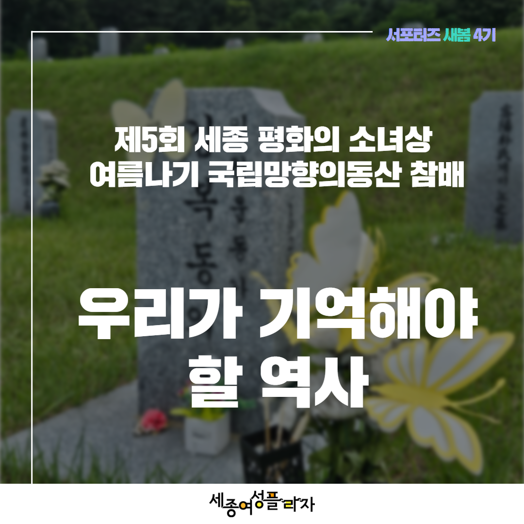![]() 서포터즈 새봄 4기 [제5회 세종 평화의소녀상 여름나기 국립망향의동산 참배] 우리가 기억해야 할 역사! 내용을 확인하고 싶다면??