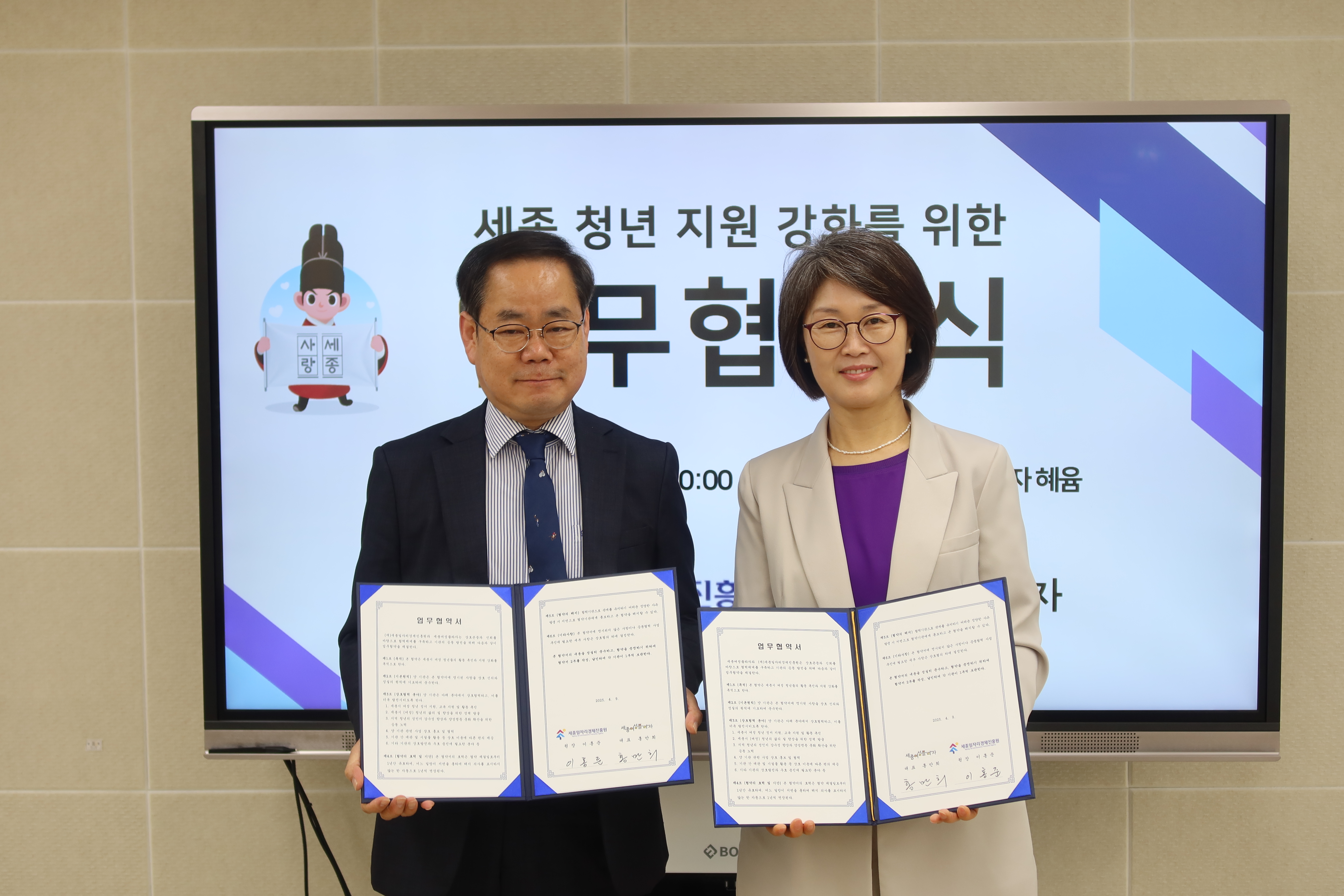 □ 일시 및 장소 : 2025. 4. 9.(수) 10:00 □ 협약내용 - 세종지역 내 일자리, 경제, 직업능력개발사업 분야의 컨트롤타워 기관으로 자리매김 - 세종지역 경력보유여성들의 경제적 역량 강화