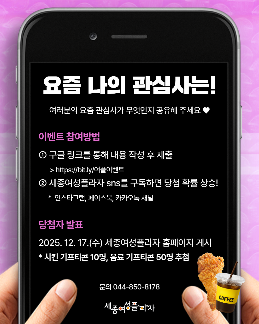안녕하세요 요즘 나의 관심사는! : 세종여성플라자와 함께하는 연말 이벤트를 진행합니다. 여러분의 요즘 관심사가 무엇인지 공유해 주세요 (∩^o^)⊃━☆ 다음과 같이 기록을 남겨주시면 추첨을 통해 치킨 기프티콘(10명), 음료 기프티콘(50명)을 드립니다.