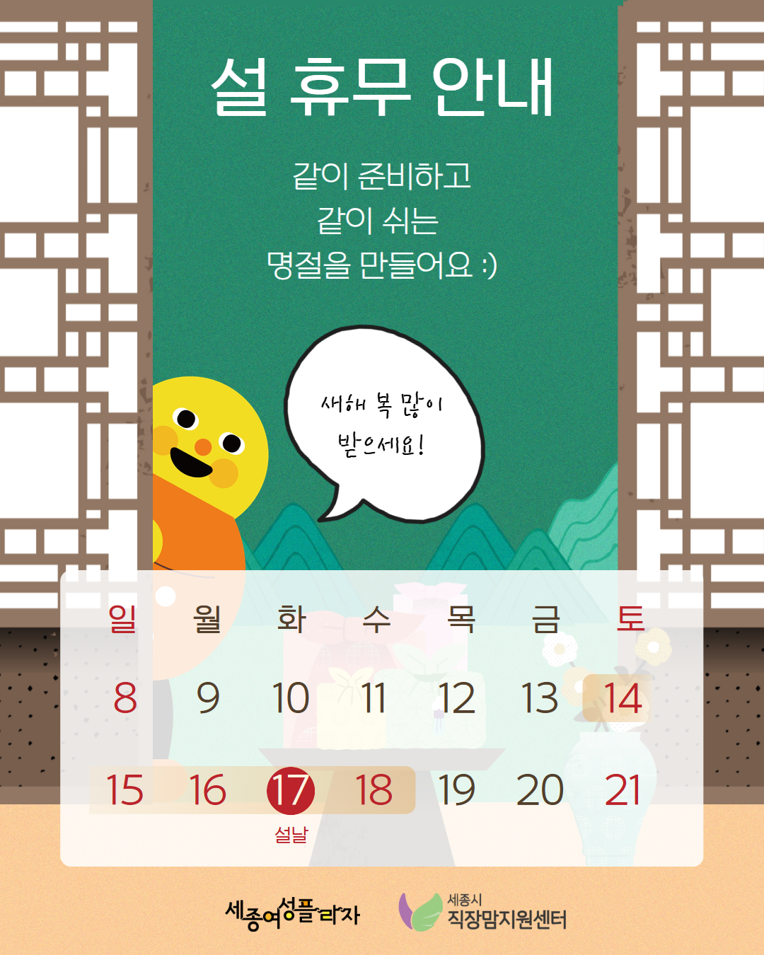 ![]() 세종여성플라자, 직장맘지원센터 설 휴무 안내드립니다.