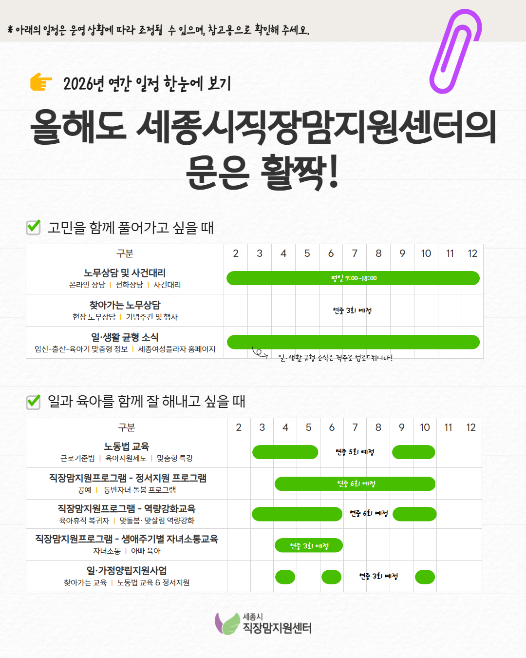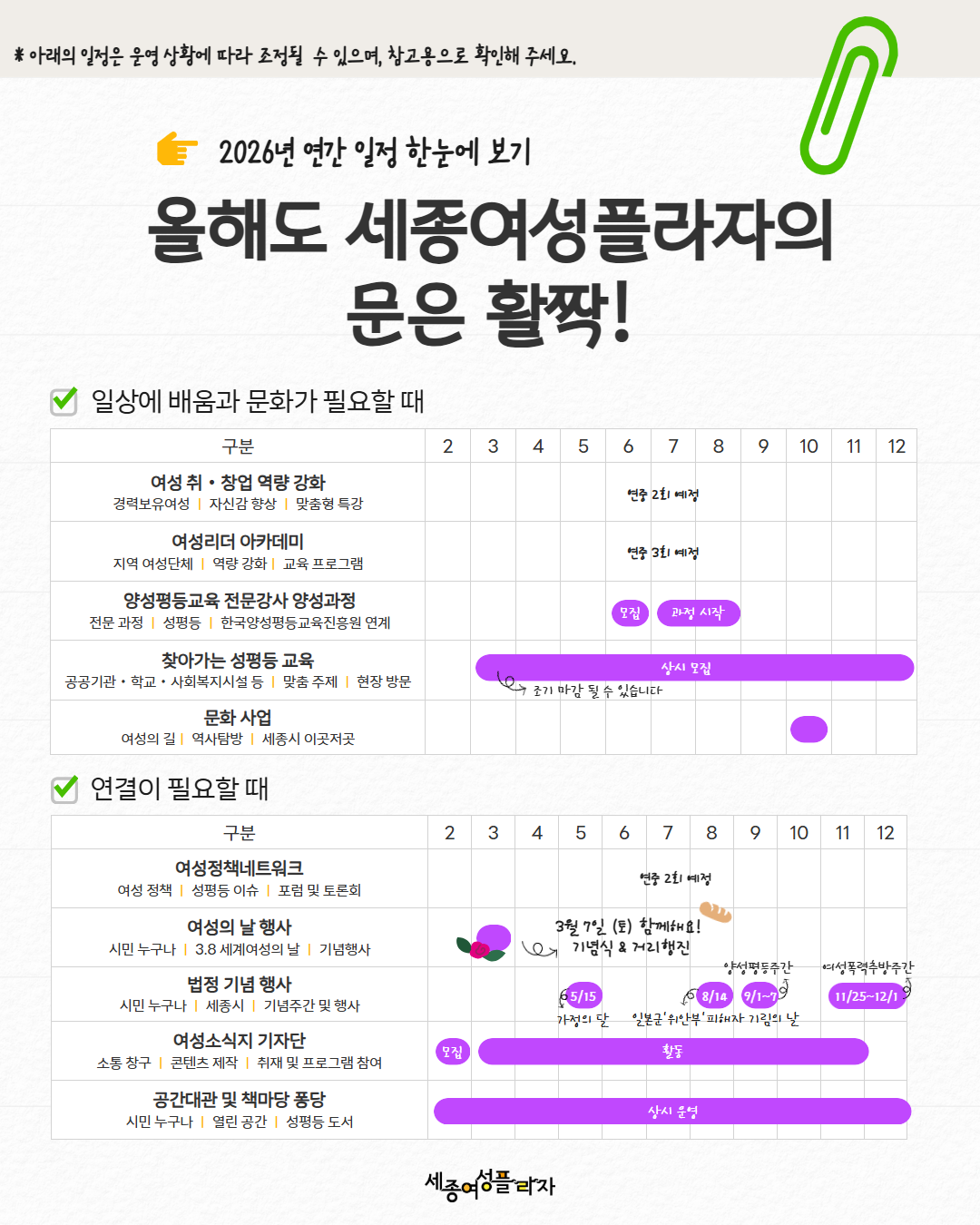 정보나눔 > 공지사항 정보나눔 > 공지사항 관한 표입니다. 2026 세종여성플라자, 세종시직장맘지원센터 연간 일정 작성자 관리자 작성일2026.02.09 조회수 12 - 공지사항 입니다. 첨부파일 2026_여플_연간_일정_(1).png (574.5 KB) 2026_여플_연간_일정.png (530.8 KB) 목록으로 다음글 2026 세종시 3.8 세계여성의 날 기념 이벤트 이전글 요즘 관심사 모음. Zip : 2025 연말 이벤트 내용 공유