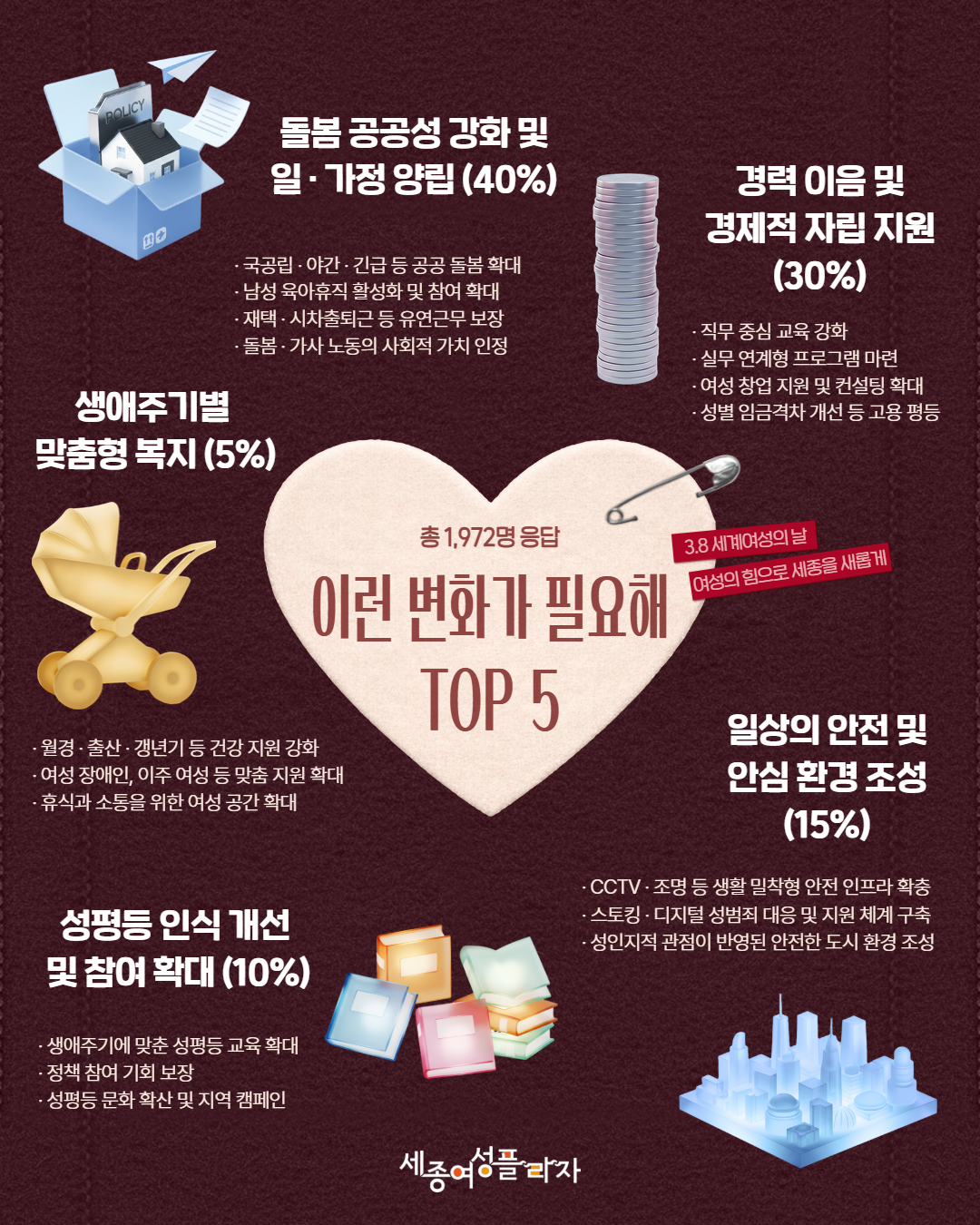 2.10.(화)부터 20.(금)까지 진행했던 온라인 이벤트! '더 나은 여성의 삶을 만들기 위해서는 어떤 변화가 필요할까요?' 라는 질문에 총 1,972명이 소중한 의견을 모아주셨습니다. 어떤 내용이 나왔을까요?? 몇 가지 공유해 드립니다. |