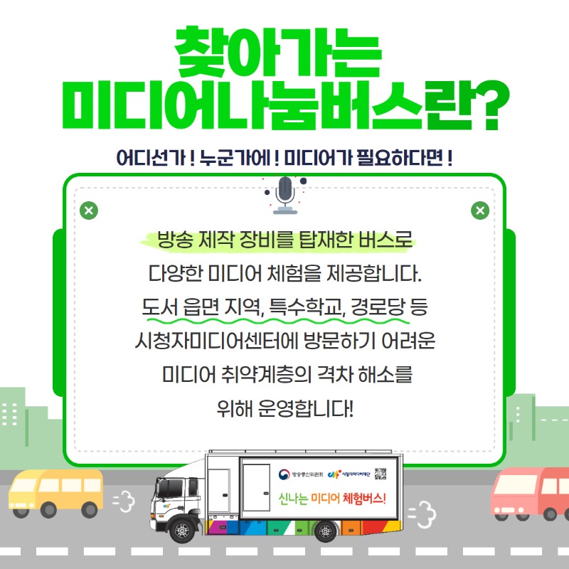 | 정책 소개 | 시청자미디어센터에 방문하기 어려운 미디어 취약계층의 격차 해소를 위해 찾아가는 미디어나눔버스 운영 | 정책 내용 | 방송 제작 장비 탑재 버스로 도서 읍면 지역, 특수학교, 경로당 등 방문하여 다양한 미디어 체험 제공 |